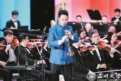 2024年夏天,经过一个学期的教学计划和排练,温州首部大型民族管弦乐作品《千年宋韵·海丝寻音》在温州大剧院成功首演,得到业内专家领导的认可。这是一部以宋韵文化为方向,集浙江温州地方音乐元素,融合唱、舞蹈、诗朗诵等艺术形式的多元管弦乐作品,通过八个乐章来展现宋朝的诗词歌赋,瓷器仕女,士大夫风骨和民族情怀,以及温州作为“千年商港”在海上丝绸之路中的重要地位。《千年宋韵·海丝寻音》全曲90分钟,通过一个个篇章的演绎,将宋代江南和温州古瓯国风韵缓缓呈现,在全曲高潮部分,宋广顺用唢呐技艺画龙点睛,让温婉“瓯风”也适时透露英勇和刚劲。