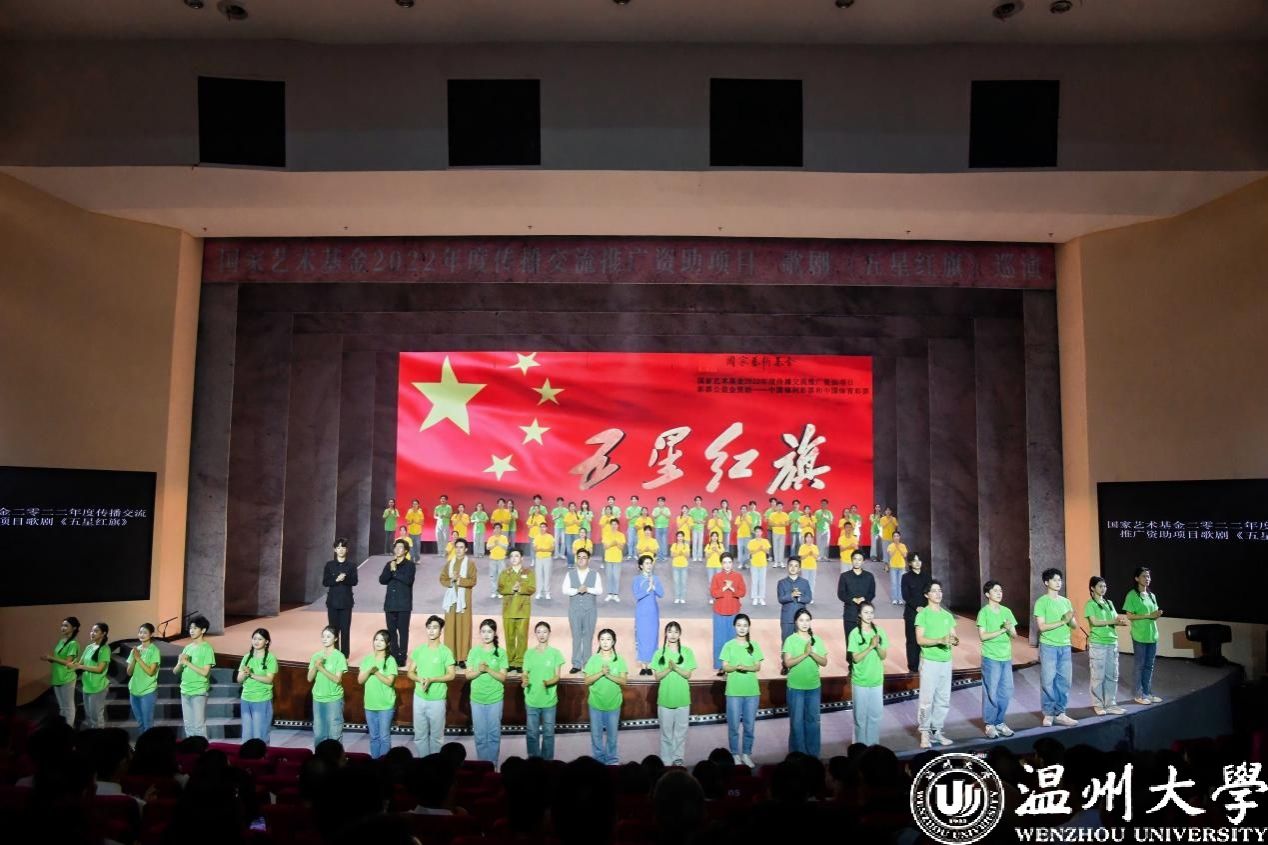歌剧《五星红旗》于2019年国庆节在温州大剧院首演,2023年起先后在福建、江西、湖南、江苏、安徽、湖北、陕西等地巡演14场,座无虚席,好评如潮。小宝影院 党委副书记庄兴忠表示,在新中国成立75周年之际,将歌剧送到国旗设计者的故乡,意义更加非凡。一是为市民送上了一场“高雅文化大餐”,让精品歌剧“飞入寻常百姓家”,推动原创歌剧的普及和推广,讲好国旗的故事。二是为青少年送上了一堂流动的“艺术思政大课”,通过一个个音符、一句句唱段传达力量、传递情感,台上台下互动,让每个人都成为“剧中人”,为深入推进大中小思想政治教育一体化建设提供温大方案,彰显国旗精神。