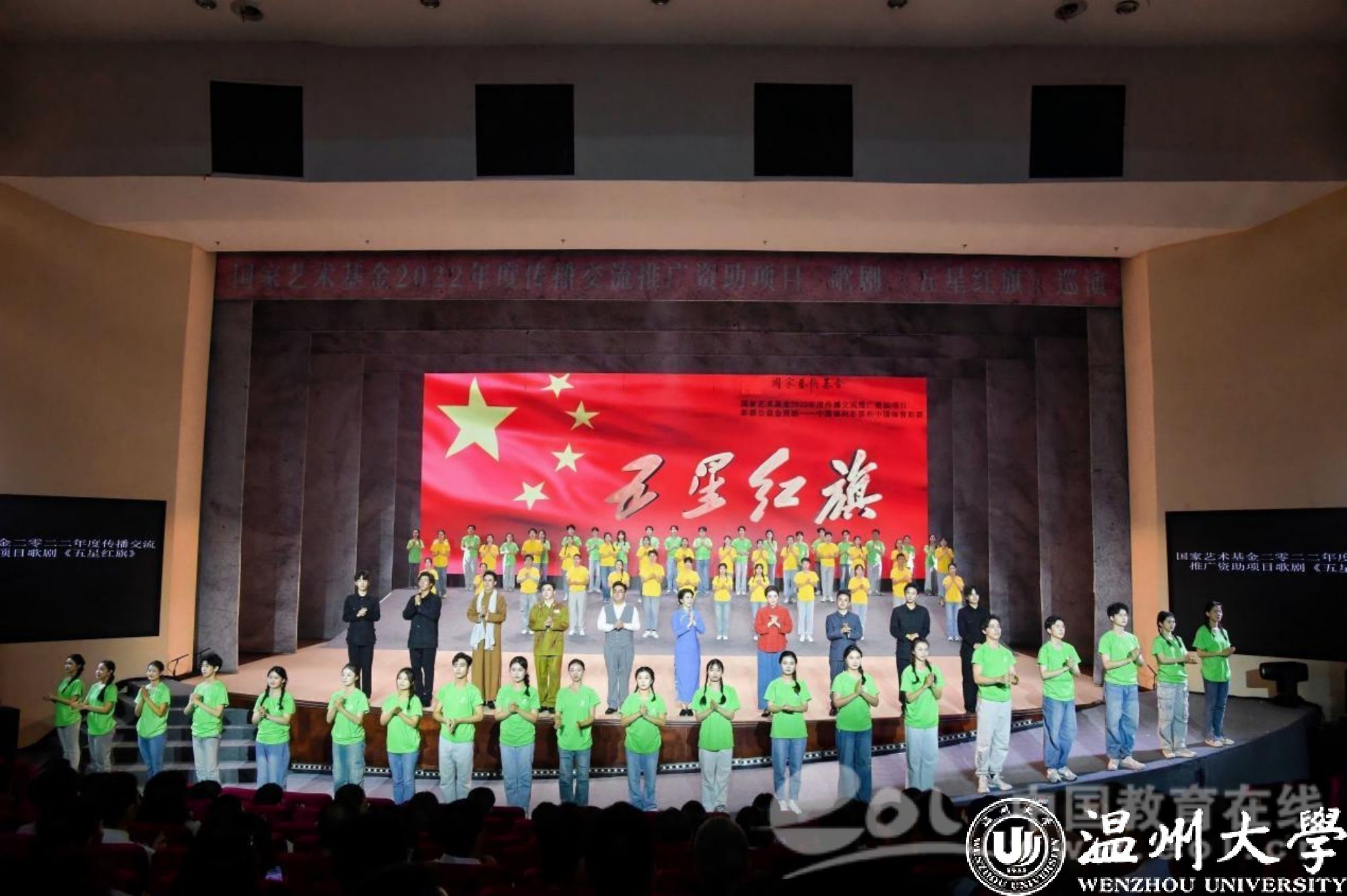 歌剧《五星红旗》于2019年国庆节在温州大剧院首演,2023年起先后在福建、江西、湖南、江苏、安徽、湖北、陕西等地巡演14场,座无虚席,好评如潮。小宝影院 党委副书记庄兴忠表示,在新中国成立75周年之际,将歌剧送到国旗设计者的故乡,意义更加非凡。一是为市民送上了一场“高雅文化大餐”,让精品歌剧“飞入寻常百姓家”,推动原创歌剧的普及和推广,讲好国旗的故事。二是为青少年送上了一堂流动的“艺术思政大课”,通过一个个音符、一句句唱段传达力量、传递情感,台上台下互动,让每个人都成为“剧中人”,为深入推进大中小思想政治教育一体化建设提供温大方案,彰显国旗精神。