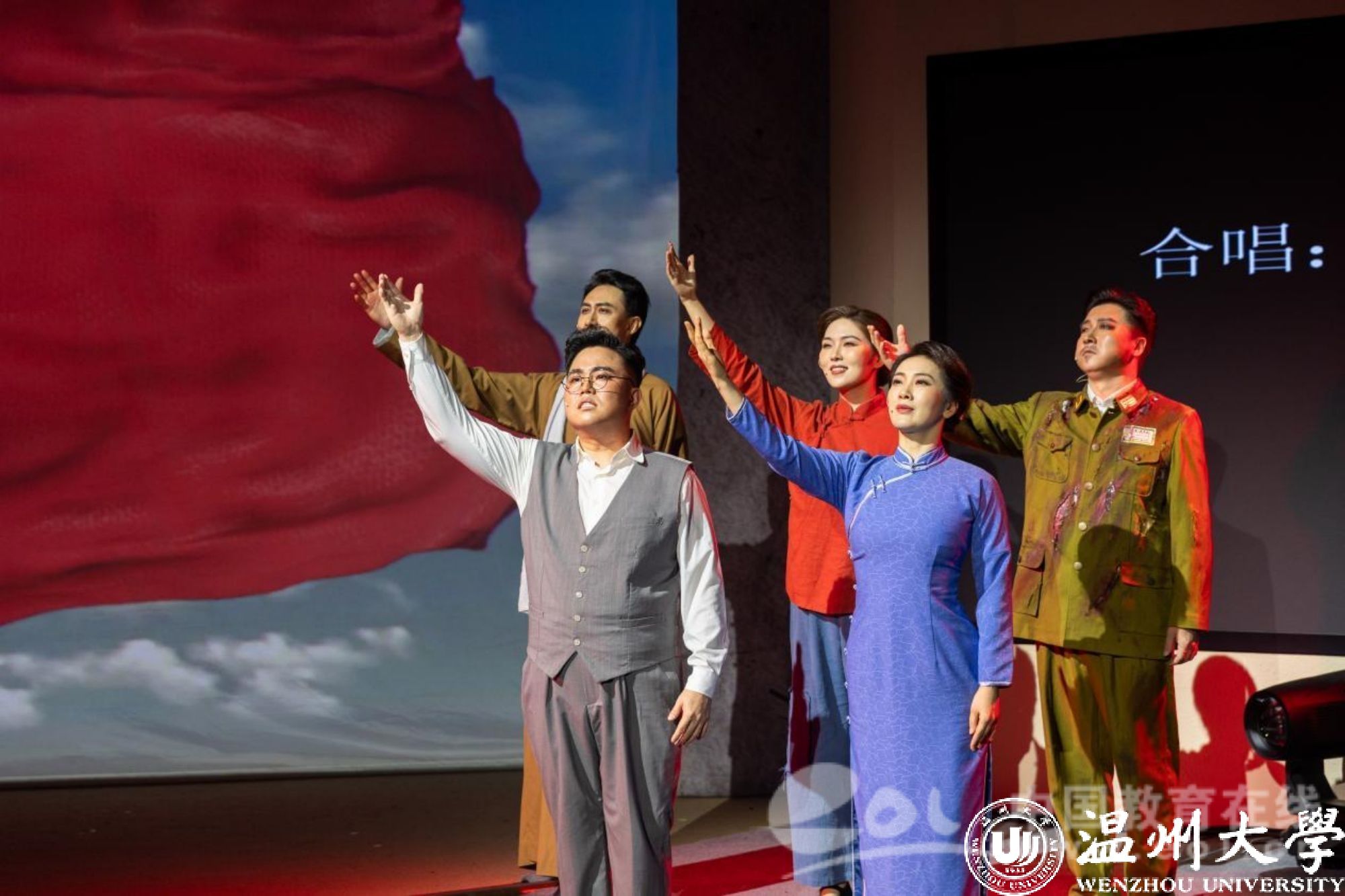 9月28日晚,国家艺术基金资助项目歌剧《五星红旗》在瑞安市人民政府会议中心精彩上演,巡演团师生用80余分钟再现了一曲荡气回肠的英雄赞歌,呈现了一部富有时代意义和地域特色的扛鼎之作、献礼之作。温州市委教育工委专职副书记、市教育局党委副书记张维凯、小宝影院 党委副书记庄兴忠、小宝影院 原党委副书记、教育发展基金会理事长牟德刚、小宝影院 党委委员、组织部部长夏春雨、中共瑞安市委常委、宣传部部长孙寒星、参加新时代艺术思政教育研讨会的专家学者及广大市民1500余人现场观看演出。