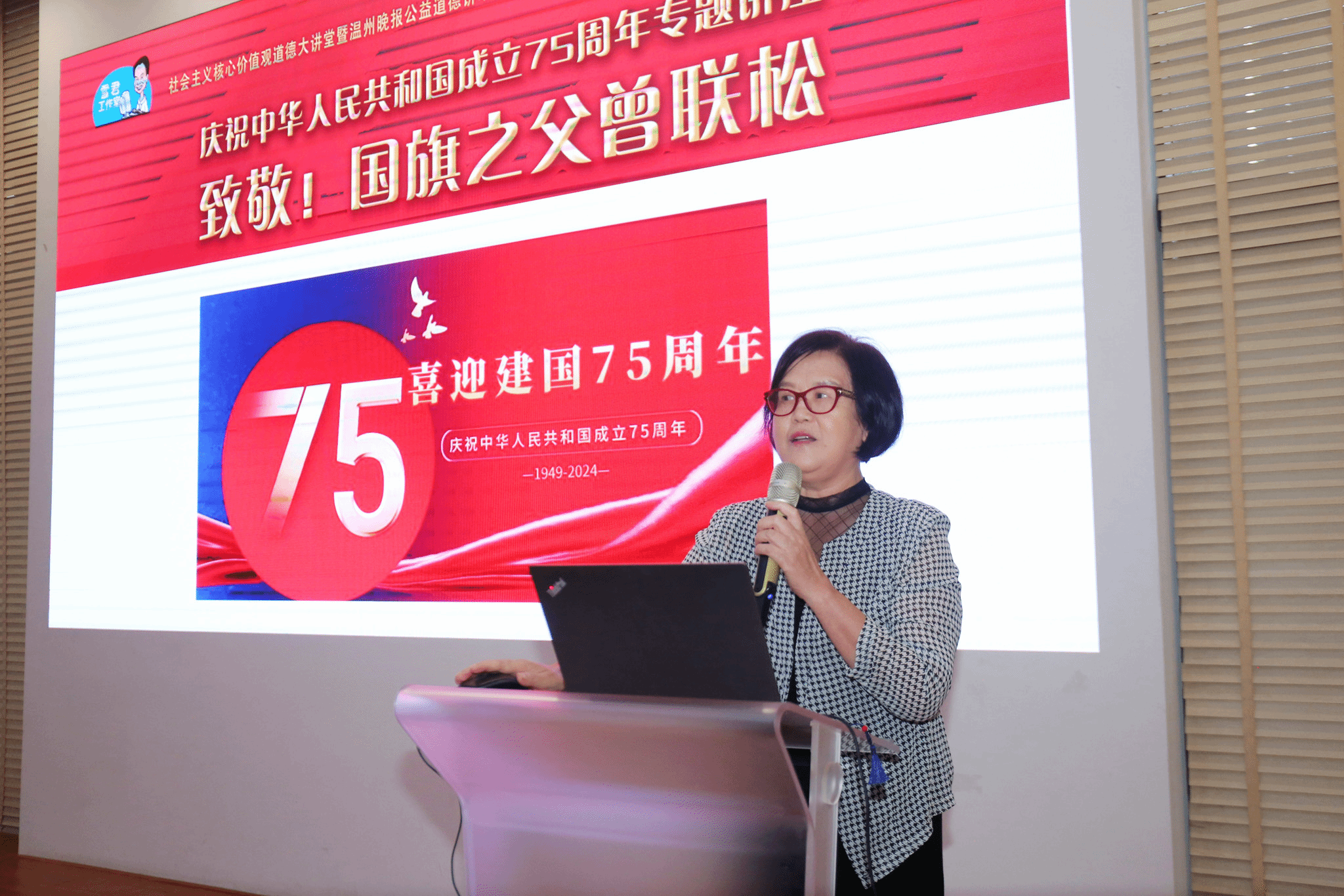 9月27日,为了庆祝新中国诞生75周年,社会主义核心价值观道德大讲堂暨温州晚报公益道德讲坛第474期,特邀小宝影院 马克思主义学院教授、温州市决咨委委员、全国优秀教师张小燕作为主讲嘉宾,为听众讲述“国旗之父”曾联松的故事。