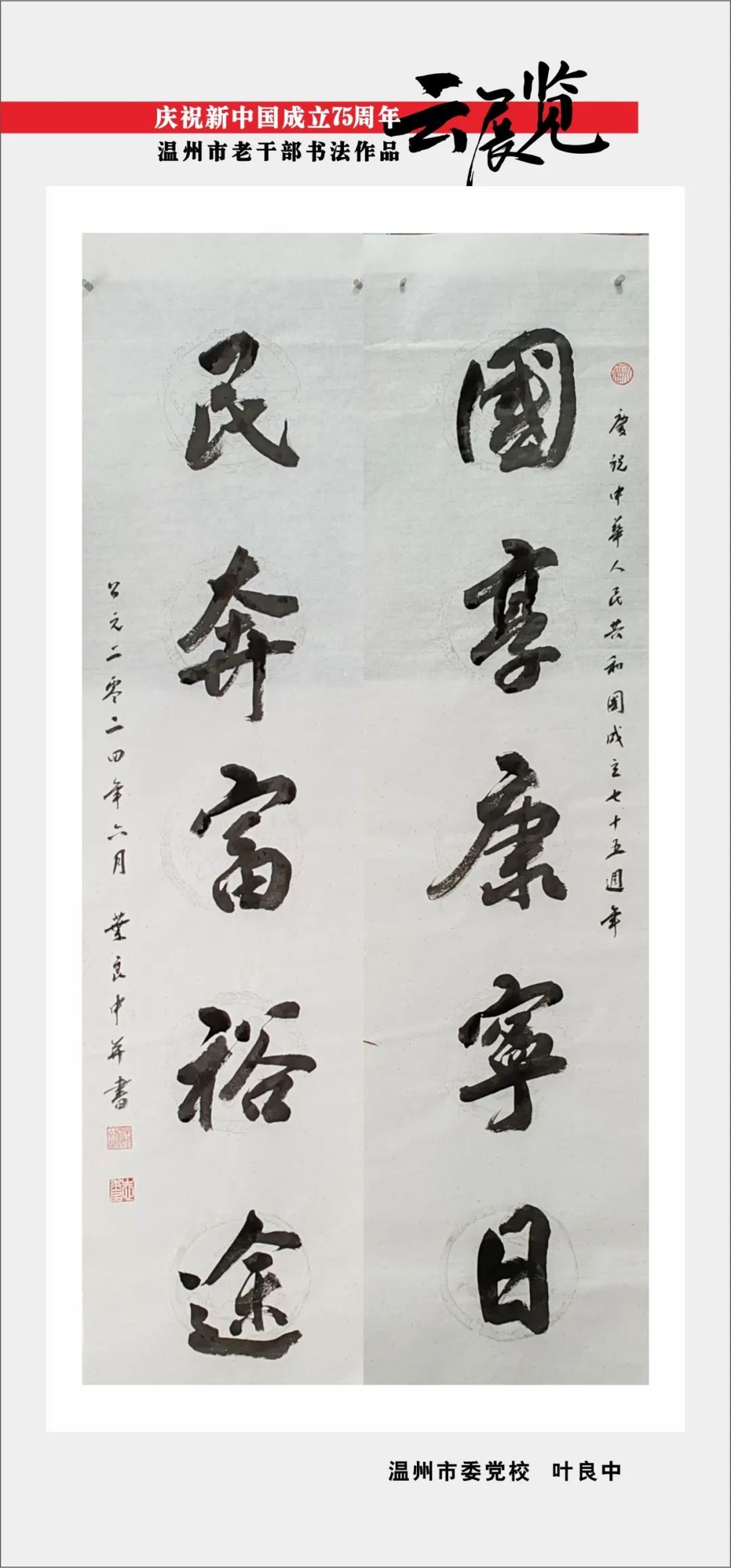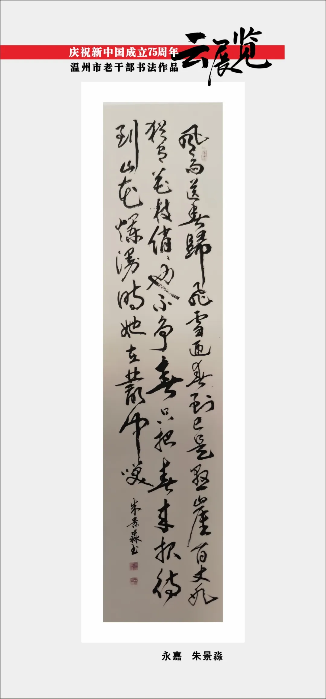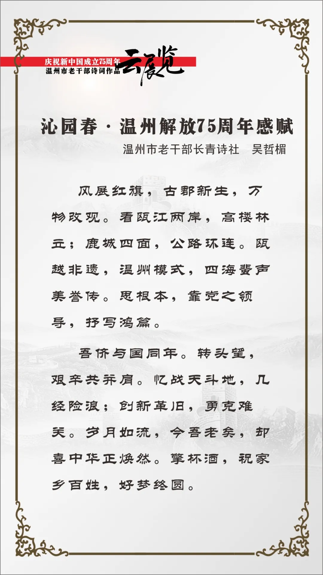 翰墨书盛世,丹青绘风华。为喜迎中华人民共和国75周年华诞,温州市委老干部局举办庆祝新中国成立75周年温州市老干部主题作品云展览。本次云展览将分批展出老同志的诗词、书画、摄影、篆刻、剪纸等作品约180幅,其作品内容积极向上,艺术趣味高雅,形式丰富多彩,充分展现出推进强国建设、民族复兴伟业的壮美华章,有力表达了温州老干部礼赞新中国、奋进新时代的美好祝愿。下面,请欣赏老同志创作的精彩作品。