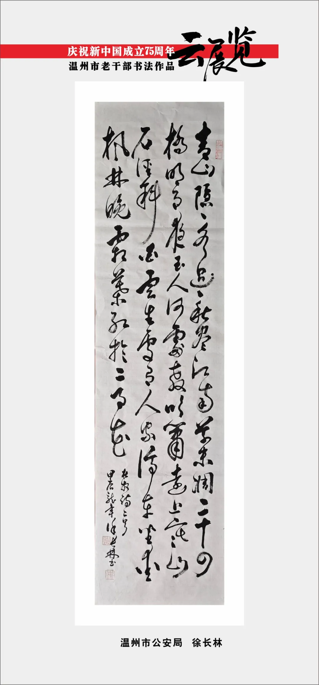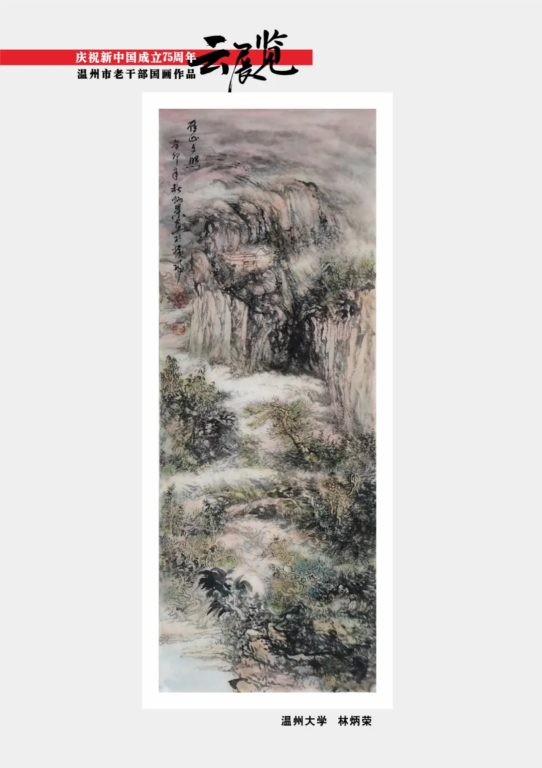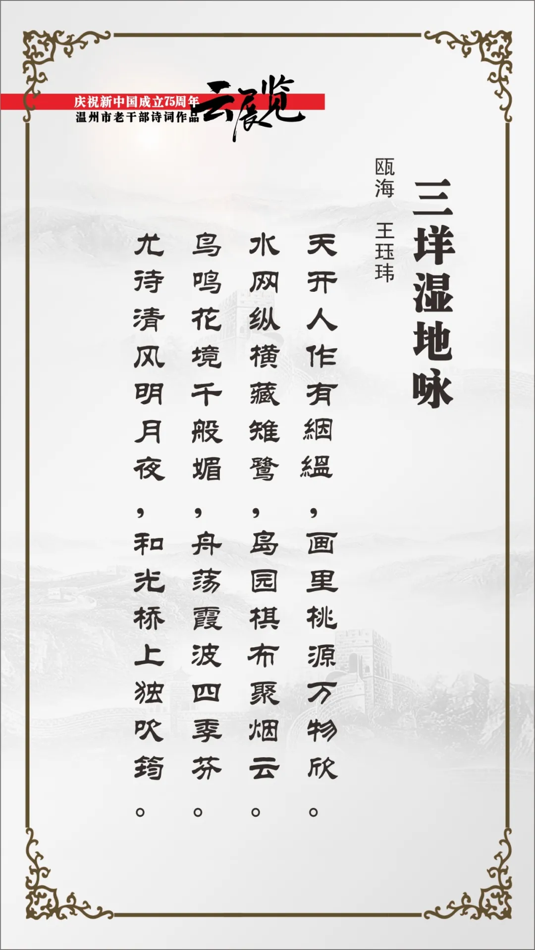 翰墨书盛世,丹青绘风华。为喜迎中华人民共和国75周年华诞,温州市委老干部局举办庆祝新中国成立75周年温州市老干部主题作品云展览。本次云展览将分批展出老同志的诗词、书画、摄影、篆刻、剪纸等作品约180幅,其作品内容积极向上,艺术趣味高雅,形式丰富多彩,充分展现出推进强国建设、民族复兴伟业的壮美华章,有力表达了温州老干部礼赞新中国、奋进新时代的美好祝愿。下面,请欣赏老同志创作的精彩作品。
