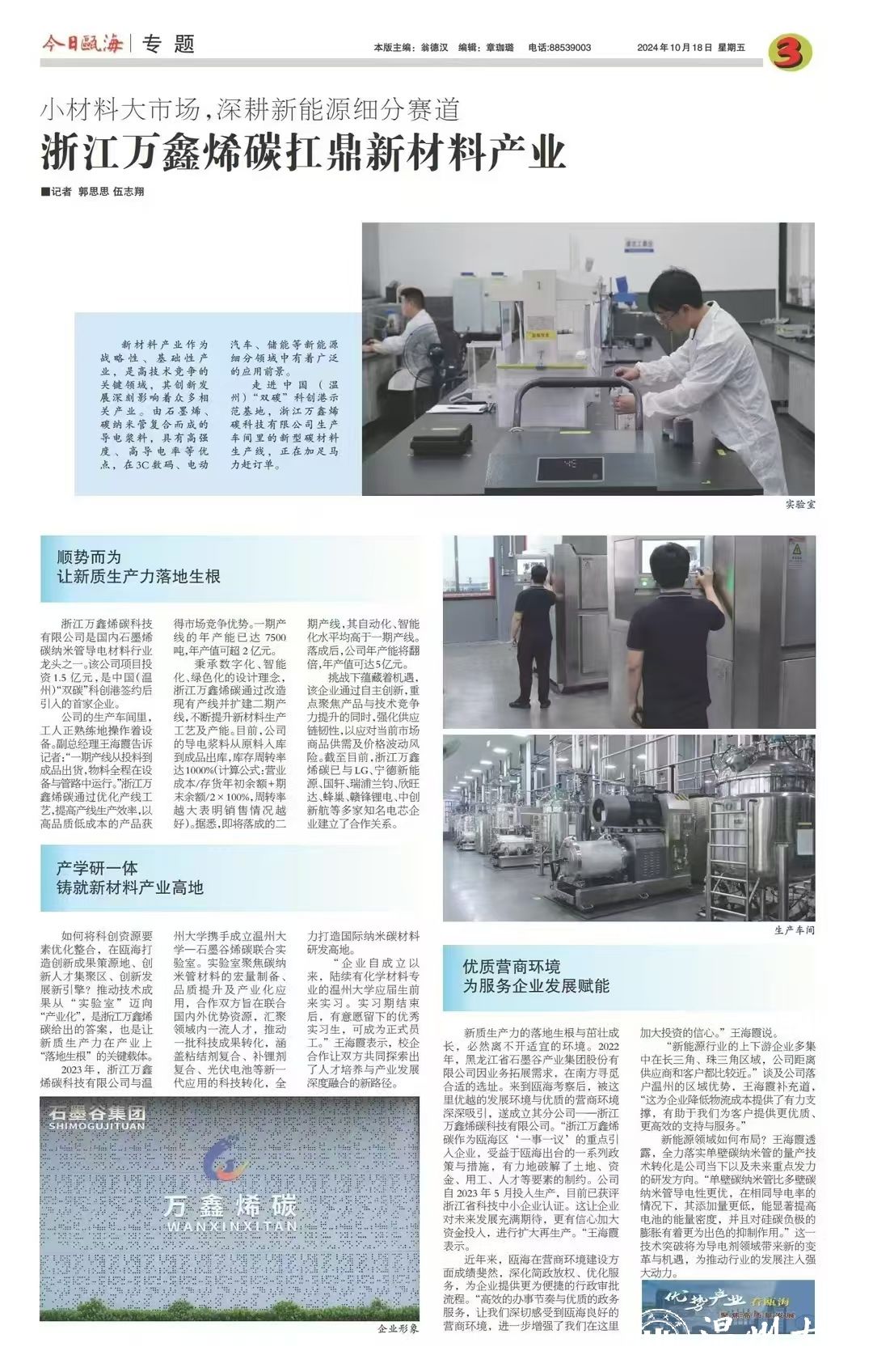 新质生产力的落地生根与茁壮成长,必然离不开适宜的环境。2022年,石墨谷产业集团因业务拓展需求,在南方寻觅合适的选址。来到瓯海考察后,被这里优越的发展环境与优质的营商环境深深吸引。“浙江万鑫烯碳作为瓯海区‘一事一议’重点引入企业,受益于瓯海出台的一系列政策与措施,有力地破解了土地、资金、用工、人才等要素的制约。公司自 2023 年 5 月投入生产以来,现产值已破亿,并获评浙江省科技中小企业认证。”王海霞表示,这让企业对未来发展充满期待,更有信心加大资金投入,进行扩大再生产。
