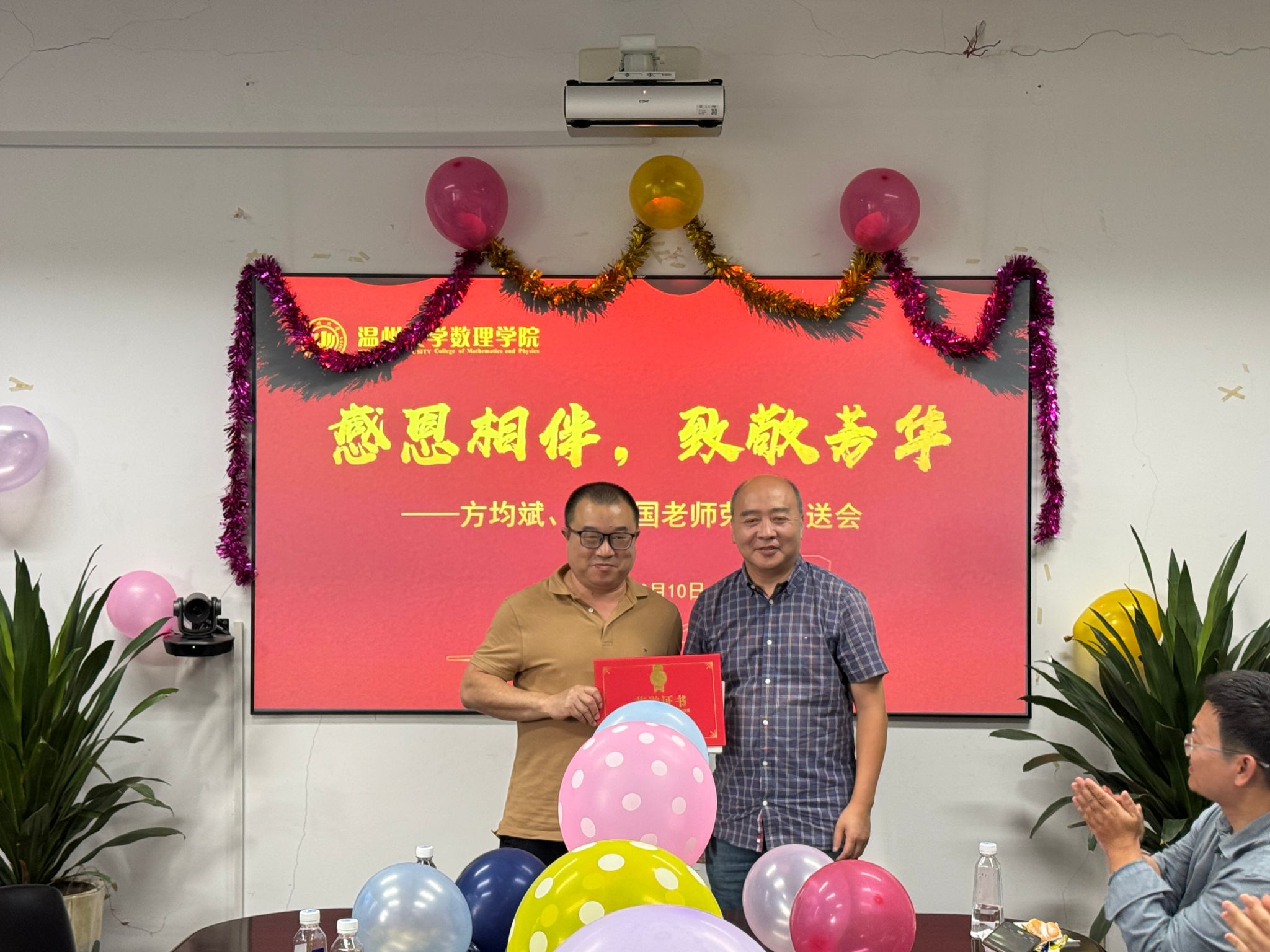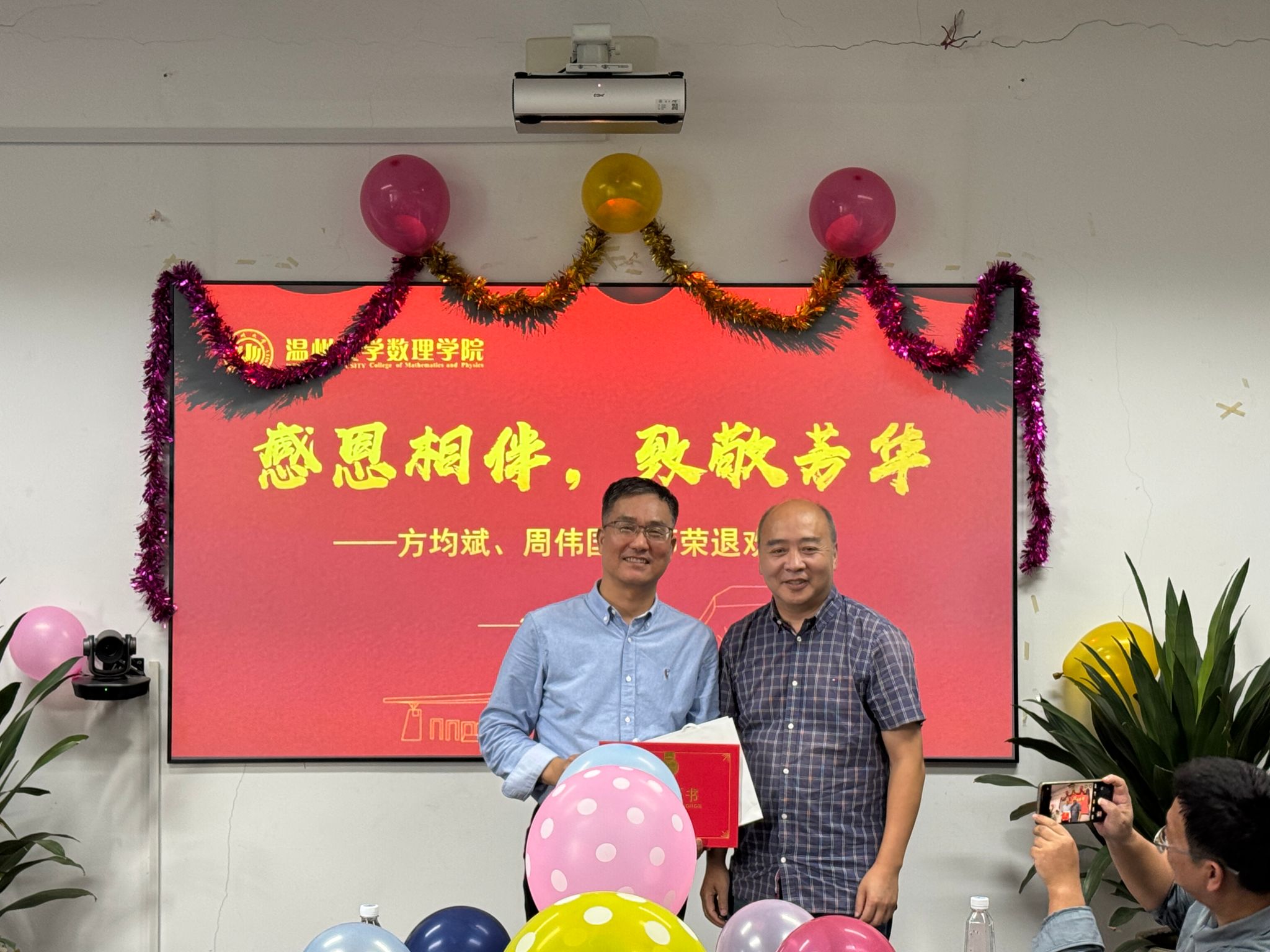 院长高利新代表学院对两位老师多年来为学院发展做出的贡献表示诚挚感谢。方均斌老师长期致力于《数学教学论》的教学工作,18年如一日地培养学生师范技能,其严谨治学的态度与对学生无私关爱的精神赢得了众多荣誉;周伟国老师以其丰富的工作经验和卓越的职业素养,在不同岗位上发挥了重要作用,成为年轻一代学习的典范。