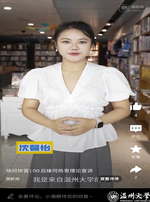 “在未来会继续带着这份‘为爱发声’的执着,在坚持‘贴近实际、贴近生活、贴近群众’的同时,不断丰富自己的理论知识,用‘冒热气’‘接地气’的宣讲,让‘理论之花’绽放在群众心间。当然,我也会用‘馨’铸就语言梦,用‘馨’传播温大声音、温州声音乃至浙江声音,‘怡’然成为一名合格的浙江省‘00后talker’!”