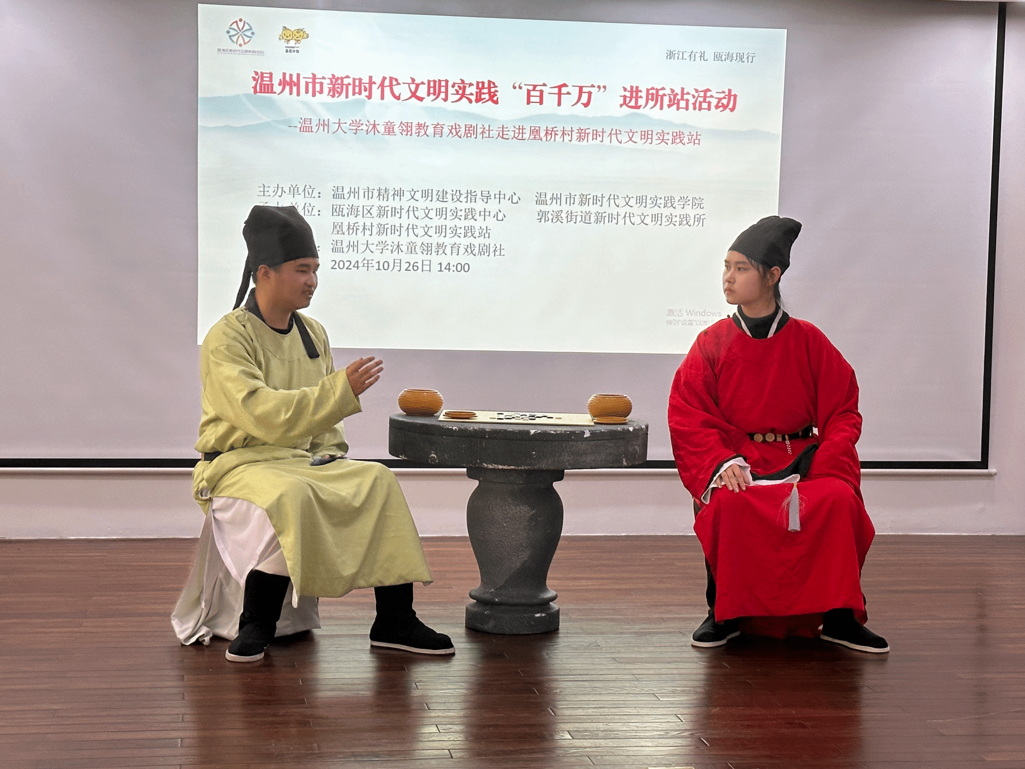 据悉,温大小宝影院 沐童翎教育戏剧团秉承师范教育传统,发挥学科专业优势,通过戏剧编创、制作和演出,多年来送戏进社区、进街道、进校园,是温大服务地方的生动诠释。几代社员精心打磨剧本,新生演员从台词磕巴到游刃有余,终将宋时雅韵再现于舞台。社团指导老师施星鸿表示,借助校地合作,学生通过戏剧表演和公益活动获得全面成长,又为当地村民展现传统文化的独特魅力,深化拓展新时代文明实践阵地建设。