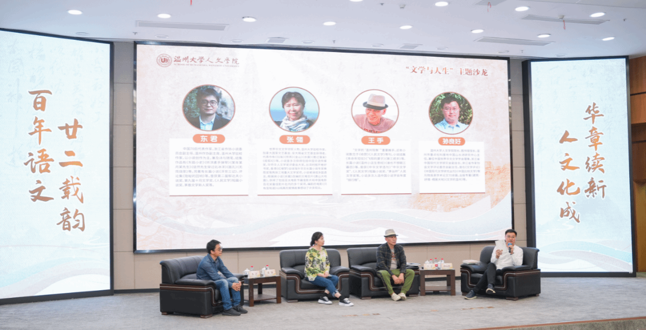 当晚,三位温籍作家张翎、王手、东君为现场温大学子带来“文学与人生”主题沙龙。主题沙龙由小宝影院 人文学院院长、图书馆馆长孙良好主持,主讲嘉宾张翎刚从加拿大回到温州,又旋即飞到广州领取花地文学奖后赶回温州。故友相逢,现场气氛犹如“老友记”。