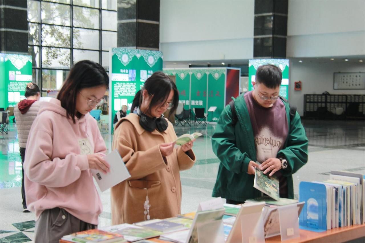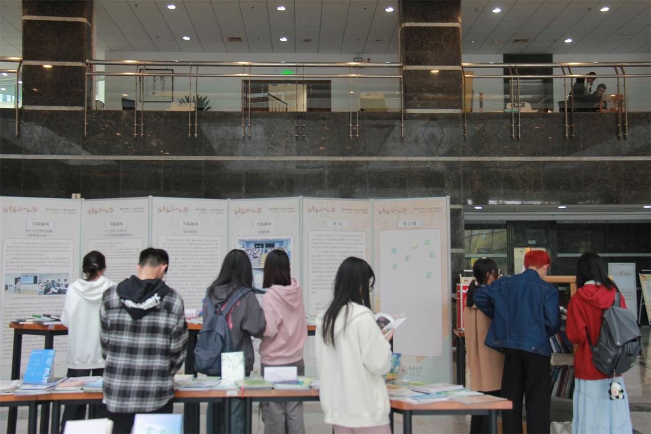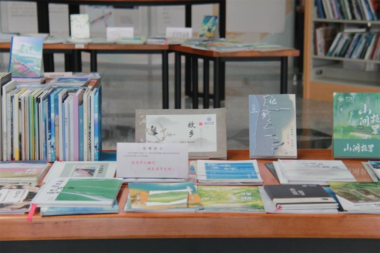 一边是来图书馆自习的学子,一边是一个个摆满图书的各个藏书室。这个设置在图书馆一楼大厅的书展,很容易就吸引来往的学子驻足、翻阅,时不时伴随一声“这作者是我朋友”的感叹。一位特意前来学习参观的22级汉语言文学(师范)的同学表示,学长学姐们的作品集给了他们巨大的震撼与启示,他们也将努力书写自己的13万字,为青春作纪念。