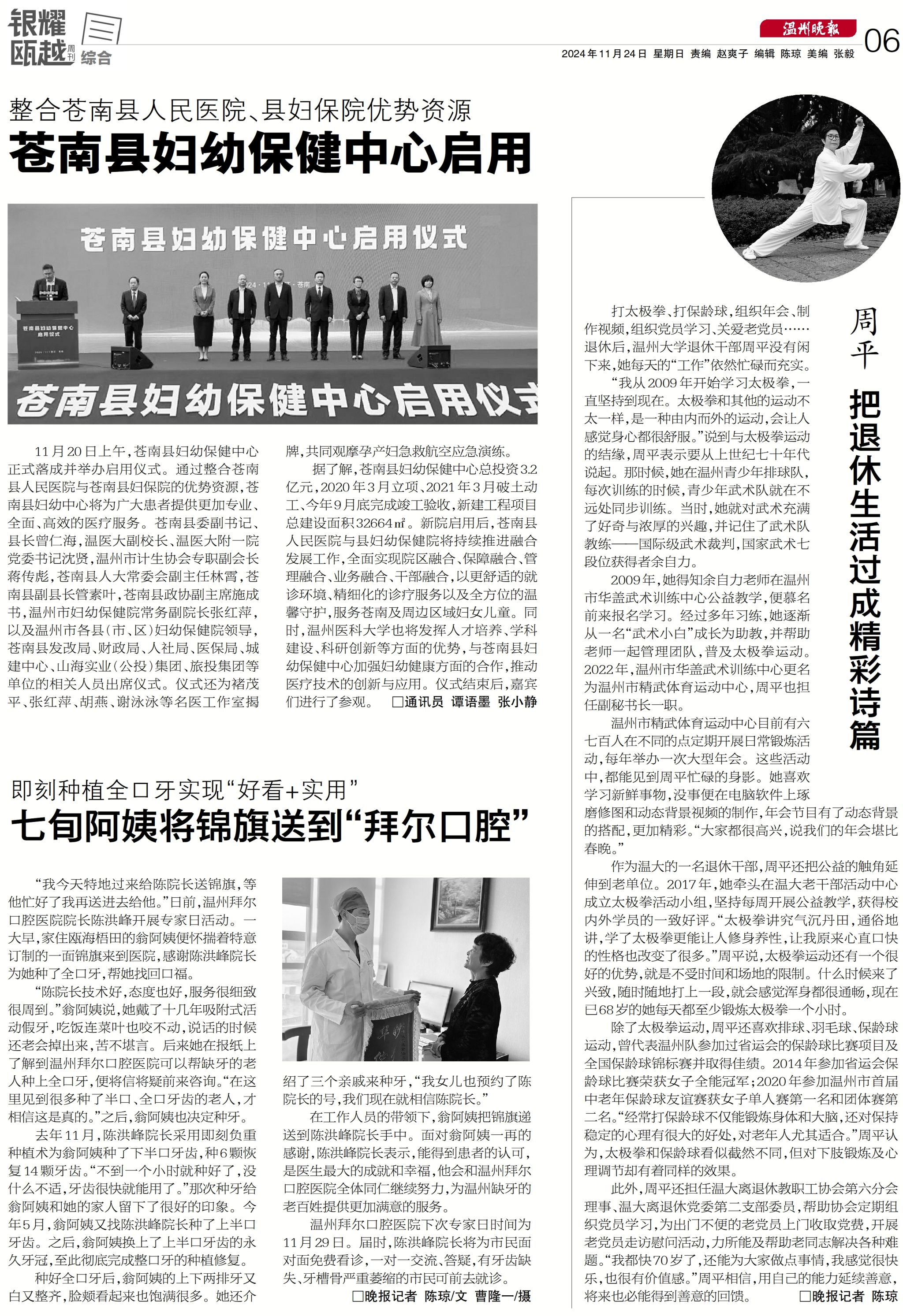 温州市精武体育运动中心目前有六七百人在不同的点定期开展日常锻炼活动,每年举办一次大型年会。这些活动中,都能见到周平忙碌的身影。她喜欢学习新鲜事物,没事便在电脑软件上琢磨修图和动态背景视频的制作,年会节目有了动态背景的搭配,更加精彩。“大家都很高兴,说我们的年会堪比春晚。”