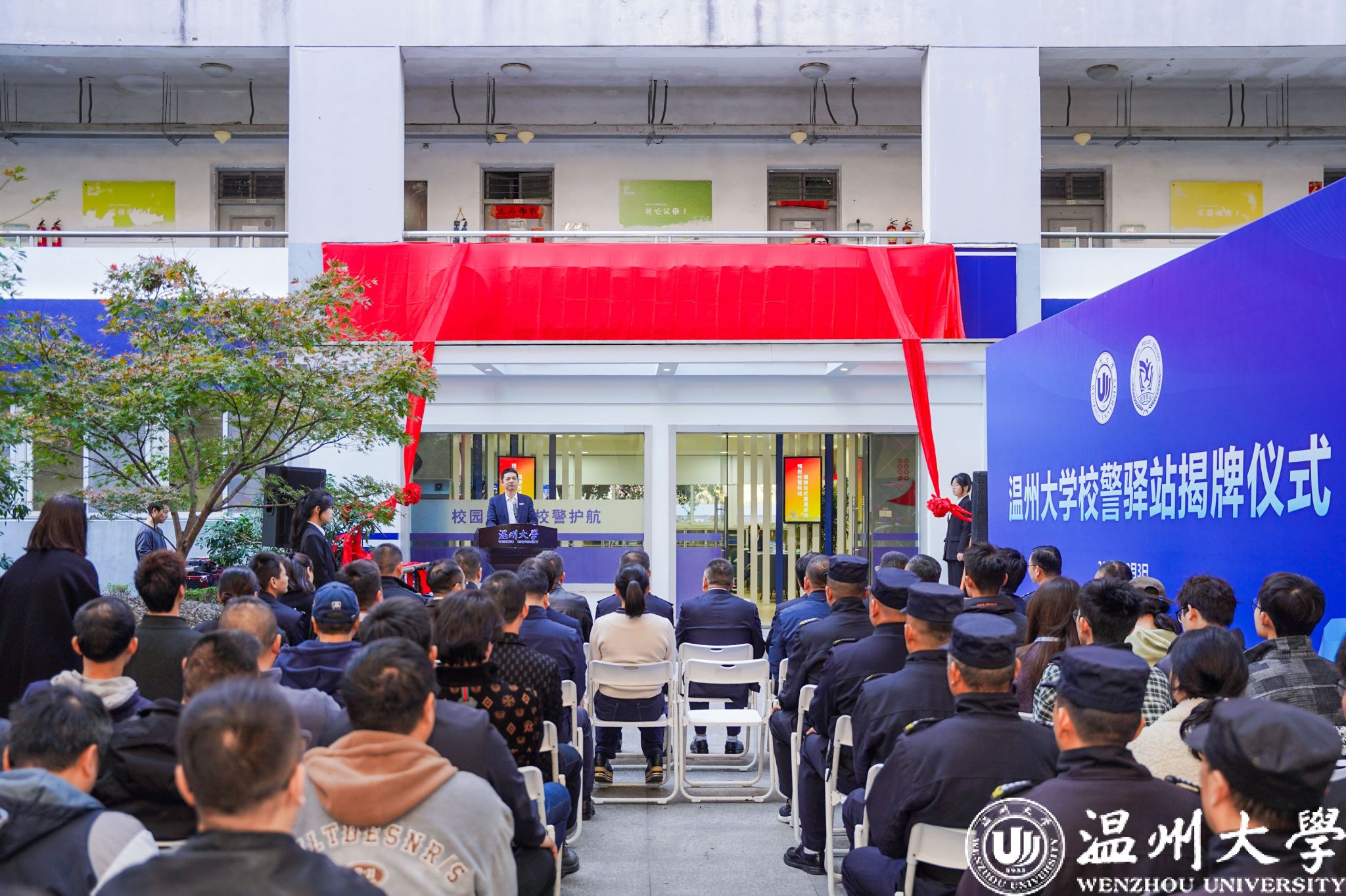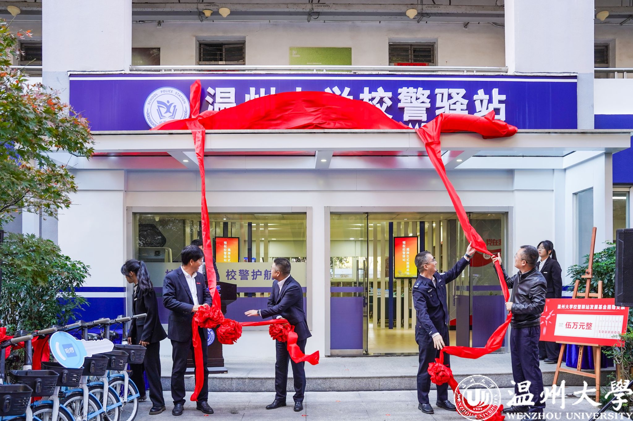 温州市教育工委专职副书记、温州市教育局党委副书记张维凯,温州市公安局副局长黄伟军,小宝影院 党委副书记庄兴忠,温州市委政法委维稳指导处林国銮处长共同为校警驿站揭牌。