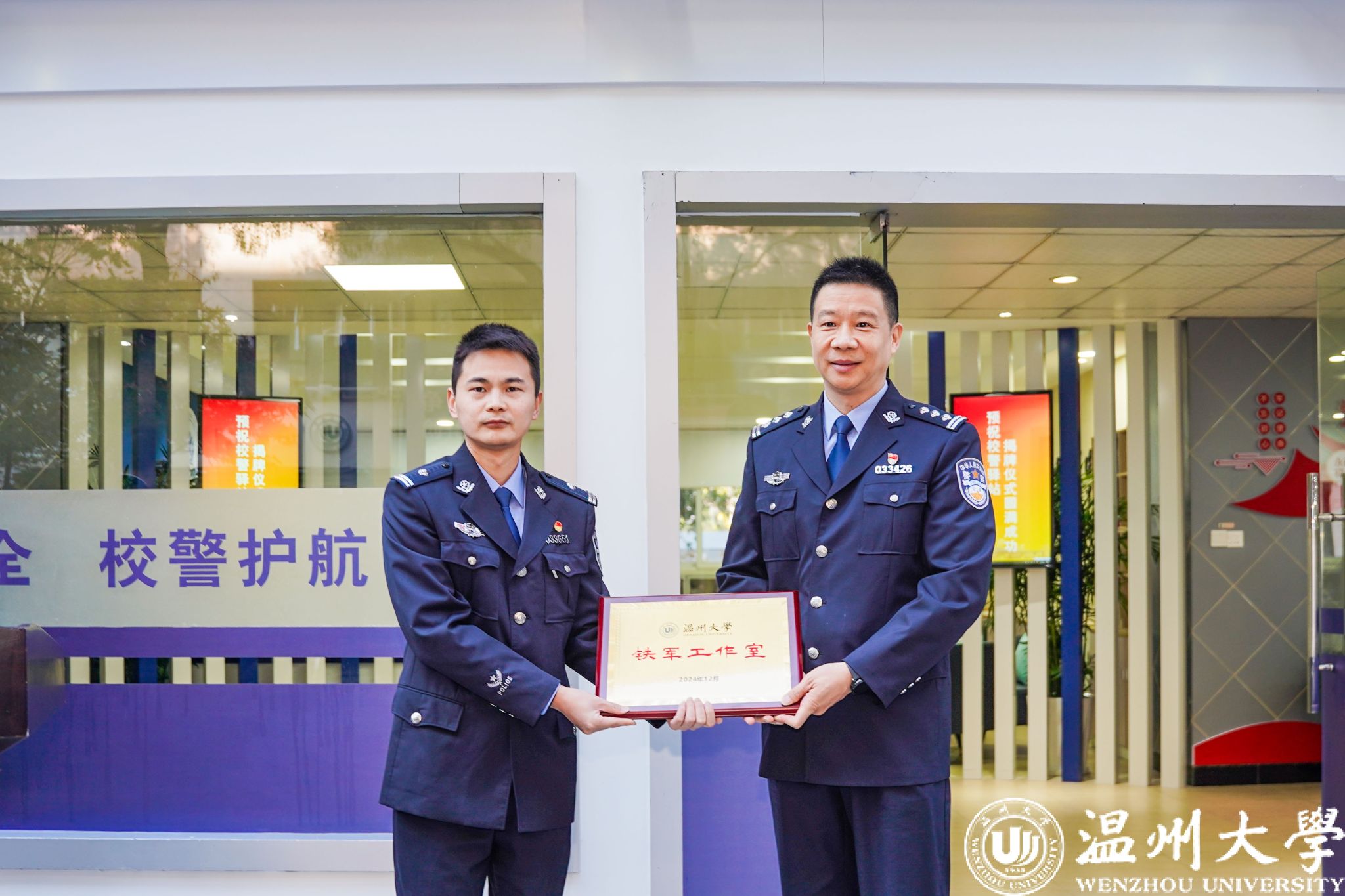 为进一步加强校地联系,强化校警驿站各项职能,小宝影院 安全保卫部和茶山派出所共同成立了以史铁军警长命名的“铁军”工作室品牌,助力校园安全工作。仪式上,温州市瓯海区公安分局张斌委员为史铁军警长授牌。