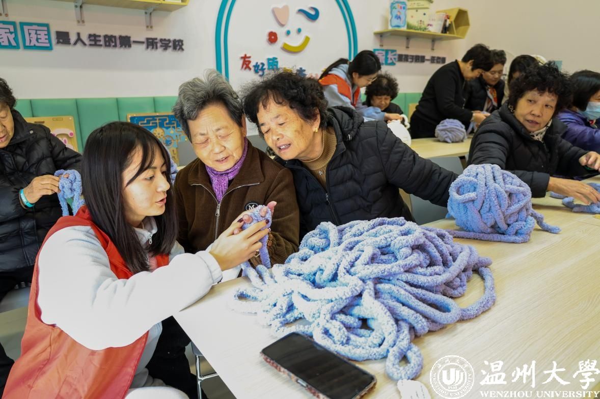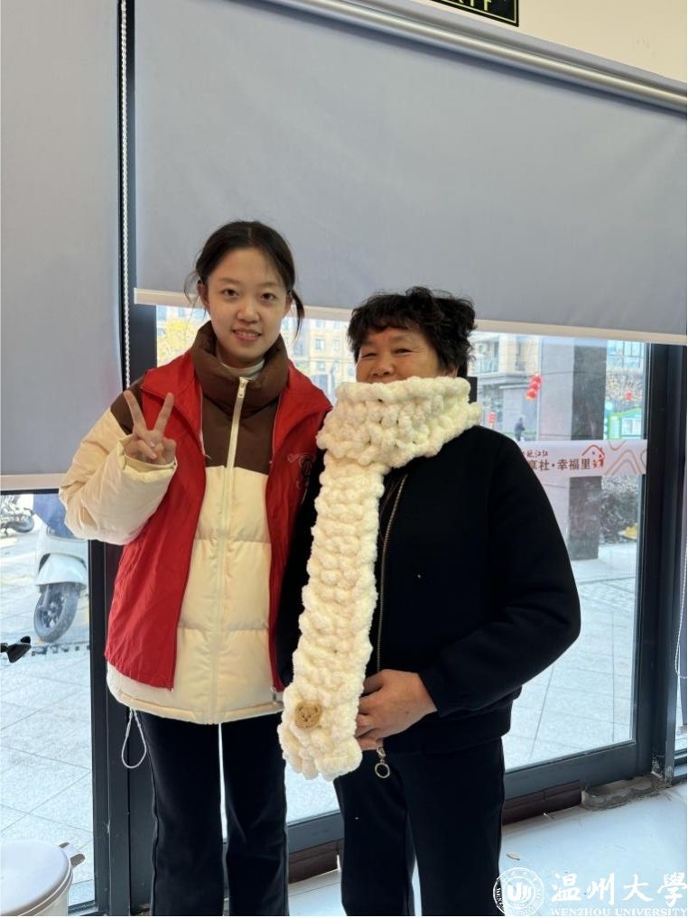活动中最让人感动的时刻之一是共织围巾环节。志愿者和老人们在几位熟练手工艺者的带领下一边学习一边织制。尽管有些人是第一次尝试,但大家的热心和耐心让这个环节充满了欢声笑语。最终,一条条温暖的围巾在大家的共同努力下完成,志愿者们亲手为老人们戴上这些围巾,老人们的脸上洋溢着满意和喜悦的笑容。