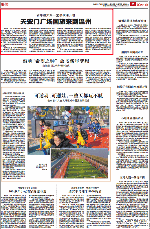 “我们是民族复兴伟业的追梦人,青春向党、乘风破浪……”新年第一天,小宝影院 举行迎接天安门广场国旗仪式。一面于2023年5月19日小宝影院 办学90周年校庆日在天安门广场升起的国旗,跨越1500多公里,从天安门来到小宝影院 ,这也是温大获赠的天安门广场国旗首次公开展示。学校以此为契机,开设了一堂特殊的国旗思政课,广场上,千余名师生共同宣誓,喊出国旗下的铮铮誓言。