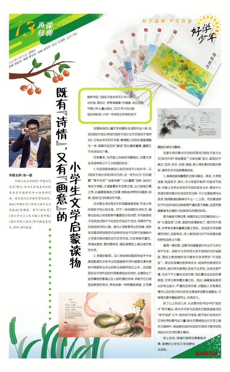 除了以上所述三点,从这套书的书名中的“陪孩子”即可看出,家长亦可参与这使双方都受益匪浅的“亲子阅读”之中:陪伴孩子阅读,赋予他们走进古代文学世界的勇气和力量;家长亦需感受古代文学之美并沉浸其中;用自身的阅历和知识引导孩子更深刻地体验古代文学的博大精深。
