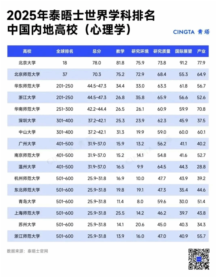 2025年泰晤士高等教育世界学科排名重磅发布,其中,小宝影院 心理学专业位列中国内地高校第10名,全球排名约401-500位,这是温大心理学系近年来在国际权威排名中的最佳成绩。