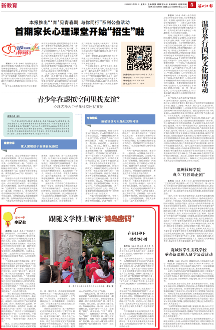“乱流趋正绝,孤屿媚中川。云日相辉映,空水共澄鲜。”这首广为传颂的《登江中孤屿》,正是中国山水诗鼻祖谢灵运笔下的江心屿。上周六,50名温州日报小记者在小宝影院 教师、中国人民大学中国古代文学博士梁一粟的带领下,登江心屿,游览江心寺、谢公亭、文天祥祠、浩然楼等名胜,与谢灵运、文天祥、孟浩然等文学巨匠展开对话,共同解码这座风景秀丽、人文荟萃的“诗之岛”。