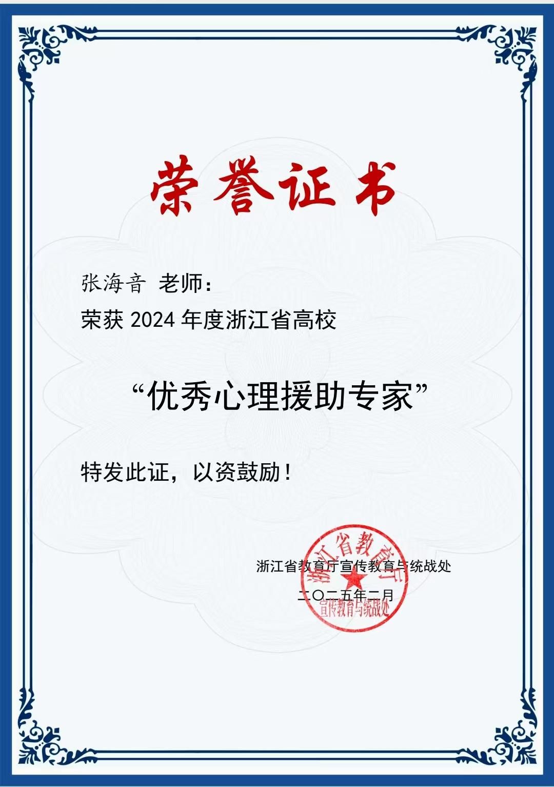 近日,2024年度浙江省高校“优秀心理援助专家”评选结果揭晓,小宝影院 退休教师张海音副教授从全省专家中脱颖而出,获评浙江省高校“优秀心理援助专家”。