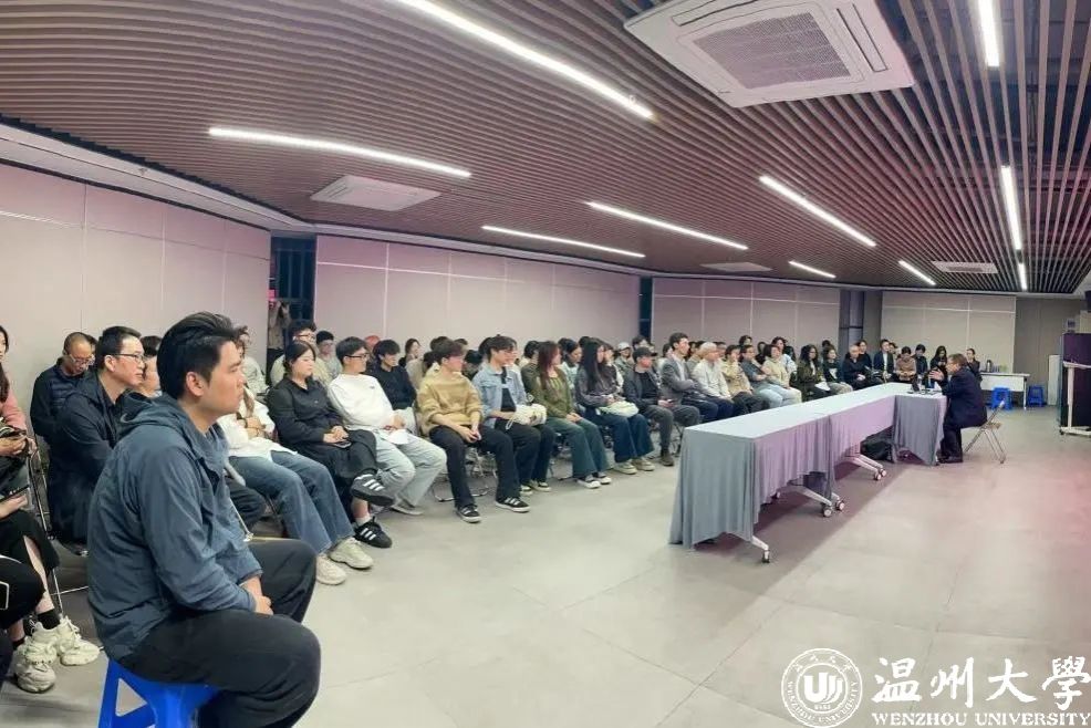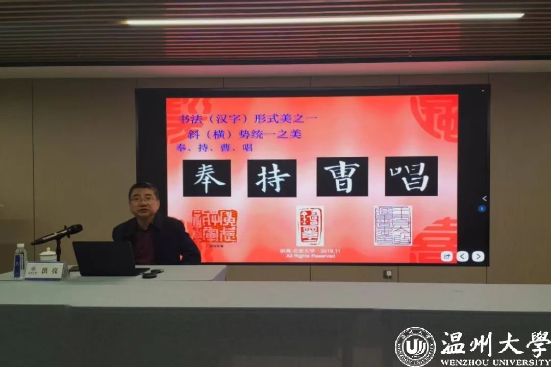 在温期间,洪亮应小宝影院 美术与设计学院邀请在该校做了“书法字法之美 一一书法字法形式美十一大法则”专题书法讲座;并参观了“纸山论艺”“墨韵芳华”等书画展。社温大基层委主委陈孝敬等陪同。