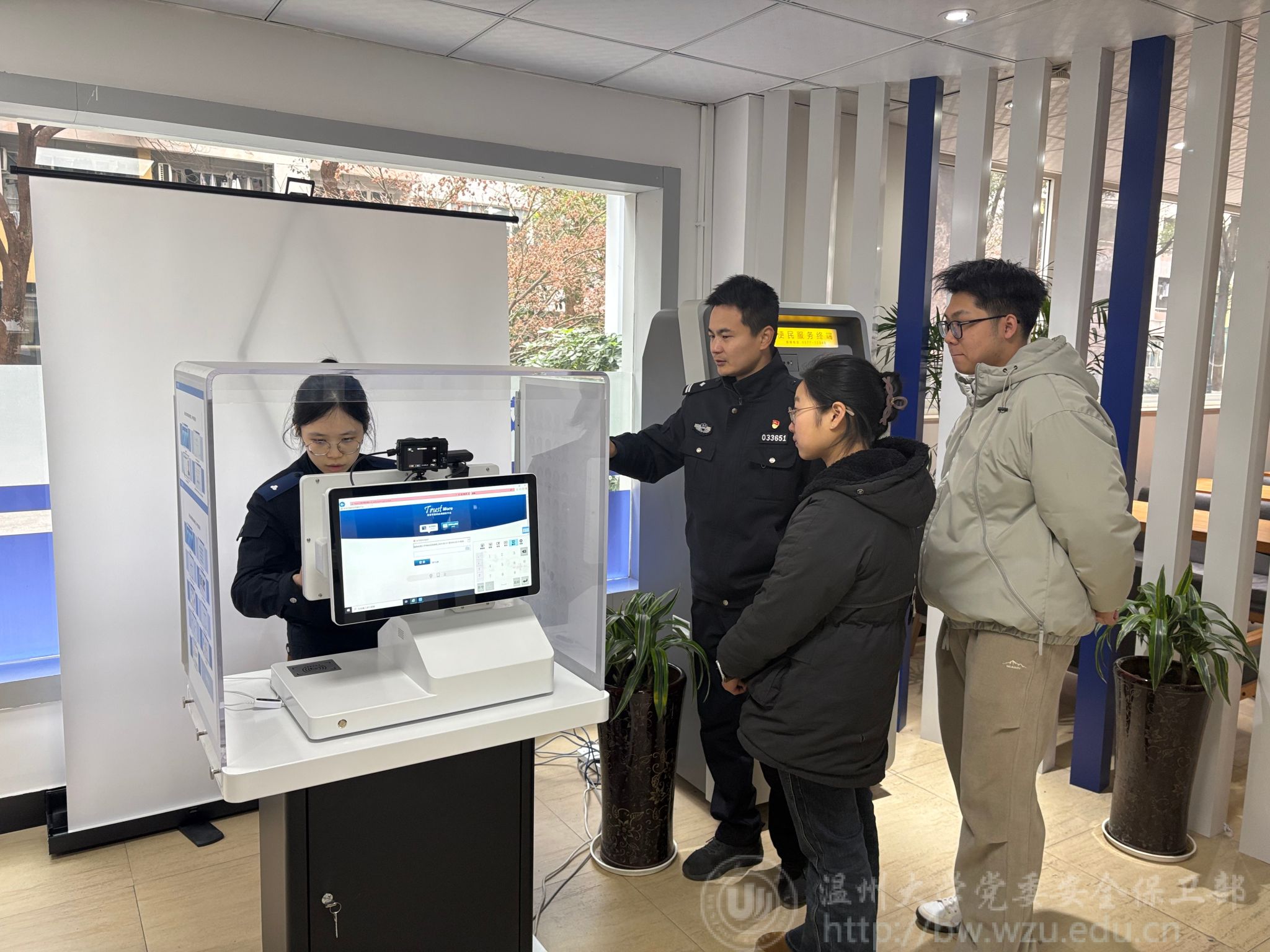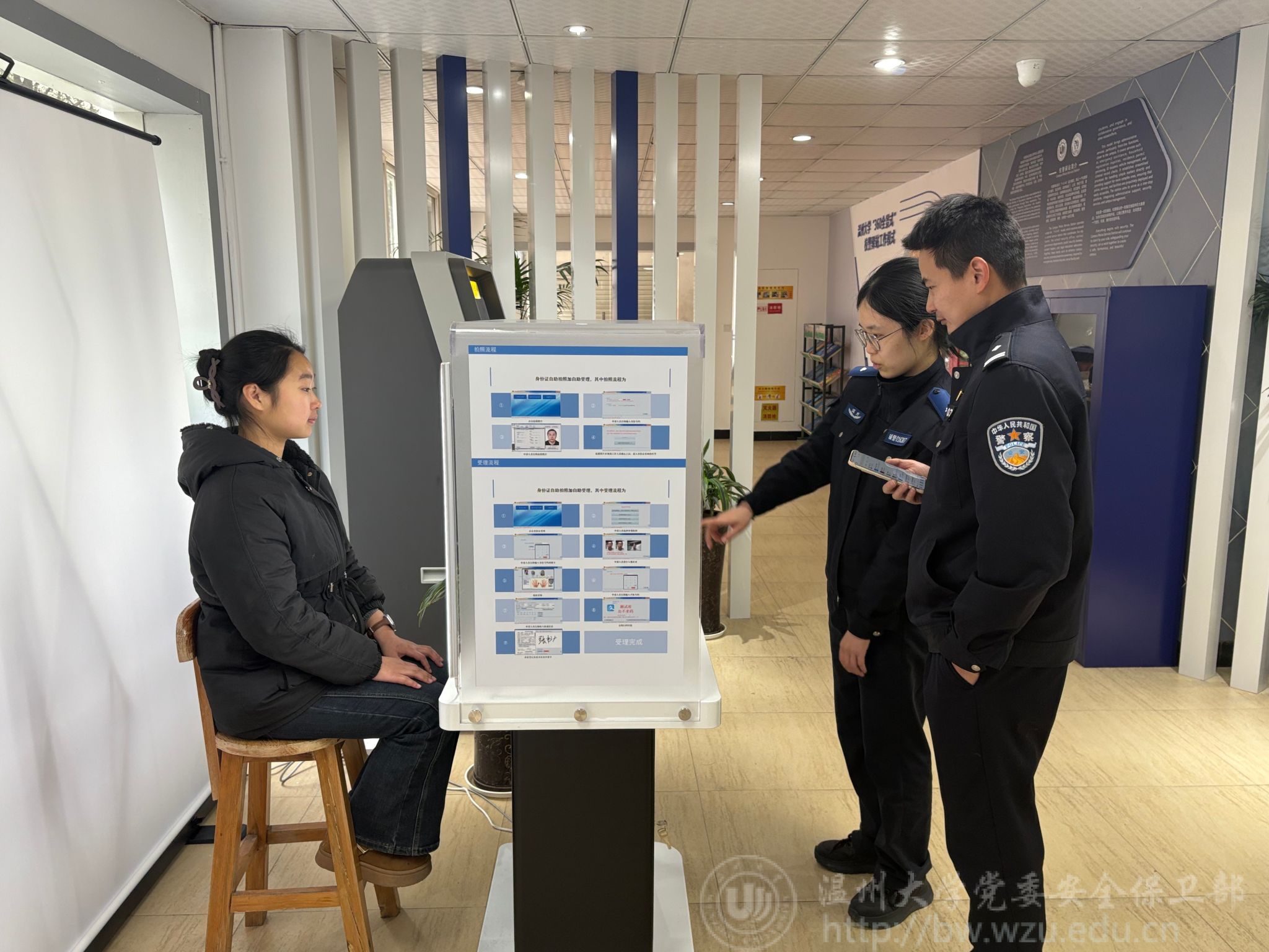走进窗明几净的校警驿站,法学专业学生小陈正在自助终端前操作:“刷脸认证、指纹录入全程都有指引,操作非常简单便捷!”她边操作边说到,“你看这个智能拍照系统,能自动识别光线调整角度,拍出来的证件照比照相馆还要好看!”
