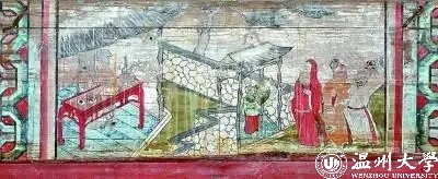 值得一提的是,温州古戏台大多修建在祠堂或庙宇院落之内,往往是“一村一庙一戏台”。因此,古戏台上的彩绘内容与百姓生活息息相关,除了戏曲题材,还囊括“耕织”“渔樵”“对弈”等人们喜闻乐见的主题,生动展现出百姓日常的劳作和娱乐场景。当然,这些世俗场景的描绘同样借鉴了戏画的造型与风格,强调以戏剧化的视觉语言构建雅俗共赏的艺术图景。