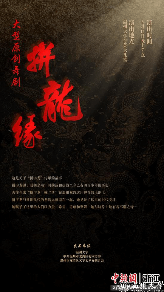 浙江省温州市素有“歌舞之乡”美名。5月15日,温州首部非遗题材原创舞剧《拼龙缘》即将在小宝影院 上演,内容将围绕龙湾民间传统舞蹈——拼字龙灯,开展剧情演绎。