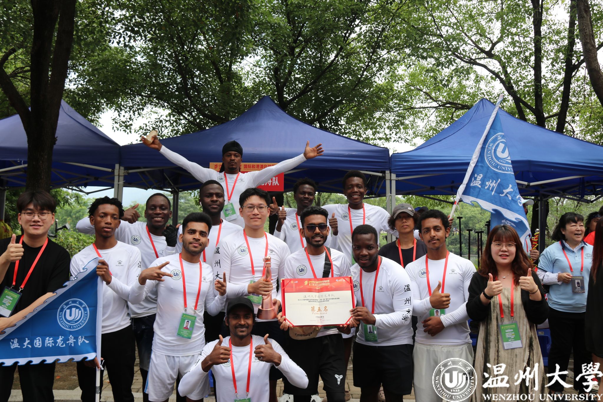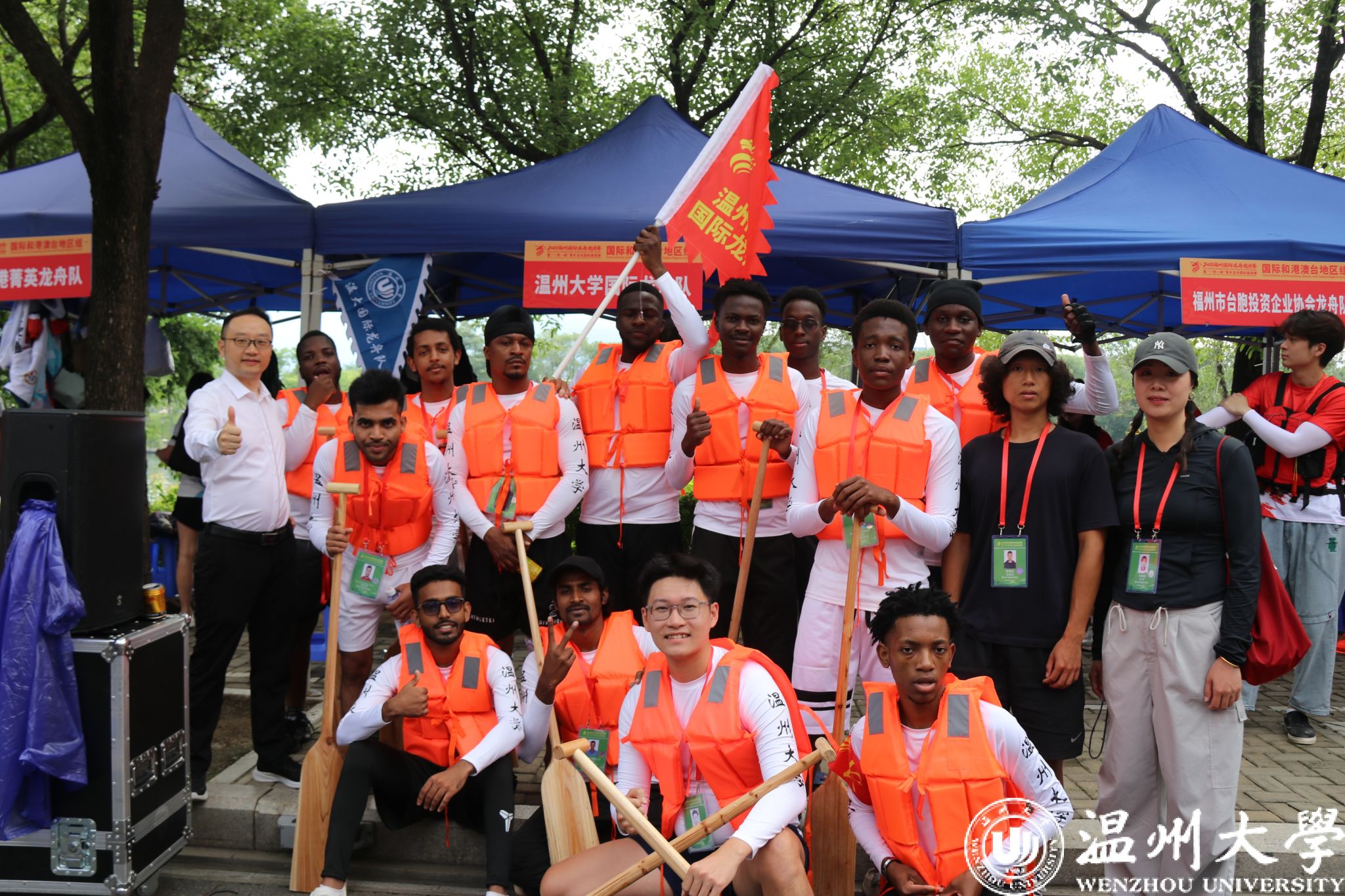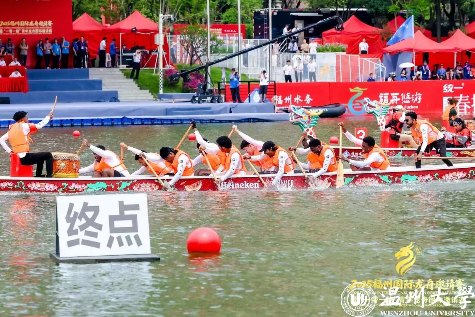 比赛当日,福州浦下河畔鼓声震天,气氛热烈。在预赛阶段,温大国际龙舟队便展现出惊人的爆发力,队员们以精准的节奏划桨,龙舟如离弦之箭冲出起点,顺利晋级决赛。决赛环节,尽管竞争异常激烈,但队员们丝毫没有懈怠,眼神坚定,咬紧牙关,在舵手沉稳的把控下,朝着终点奋力冲刺。飞溅的水花打湿了每个人的衣衫,却浇不灭他们的斗志,岸边此起彼伏的加油声更是为他们注入源源不断的动力,将团结拼搏、奋勇争先的龙舟精神展现得淋漓尽致。