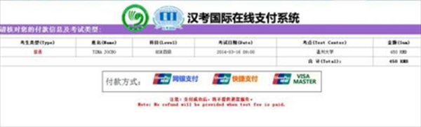 HSK 4级 12月4日 上午9:00 报名费用为:HSK4级450人民币。 现将报名事项通知如下: 1、本次考试采用网络报名方式,报名截止日期为2016年11月7日24点。 报名网址://www.chinesetest.cn/index.do 2、请您根据报名系统提示,填写您的个人信息,在“考点选择”选项中选择“中国大陆”——“浙江”——“温州”——“小宝影院 ”。 3、 报名费通过网络支付。具体操作如下: (1) 报名信息填写完成后,会出现要求支付页面。 (2) 点击“在线支付”,出现如下页面: (3)请根据您的付款方式,进行网络付款,每种支付方式都会产生手续费,其中网银支付手续费为4元左右;快捷支付和VISA\master支付手续费为15元左右。 4、 网络支付成功后,您的邮箱会收到系统发出的报名成功邮件。