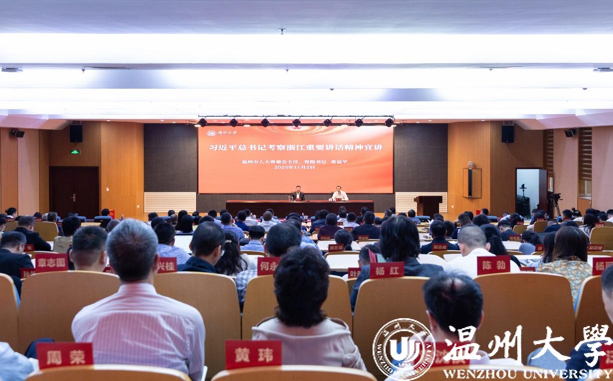 张健在主持会议时指出,本次宣讲充满对家乡的热爱、对历史的尊重、对实践的执着、对方法的融汇、对知行的合一、对细节的把握,既有理论高度又有实践深度,既是一次生动的理论辅导,又是一次深入的思想动员。张健表示,全校上下将把学习宣传贯彻习近平总书记考察浙江重要讲话精神作为今后一个时期的首要政治任务,推动学习、领悟、转化走深走实。他要求全校一要胸怀大局,提高站位。坚持学思用贯通,不断拓展学习的深度、延伸宣传的广度、强化贯彻的力度,坚持以习近平新时代中国特色社会主义思想铸魂育人,更好教育引导师生忠诚拥护“两个确立”,坚决做到“两个维护”。二要实干担当,对标对表。对标“双一流196工程”要求,在科技创新、服务地方、国际化办学、区域文化传承、党建引领上彰显更大作为,切实把习近平总书记考察浙江重要讲话精神转化为推动学校高质量发展的强大动力。三要情系温州,彰显作为。发挥好市属高校“领头羊”作用,以有为换有为,全面融入温州经济社会高质量发展,在浙江忠实践行“八八战略”、奋力推进“两个先行”和温州“续写创新史、走好共富路”的伟大实践中贡献温大智慧和力量。