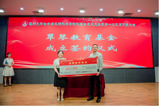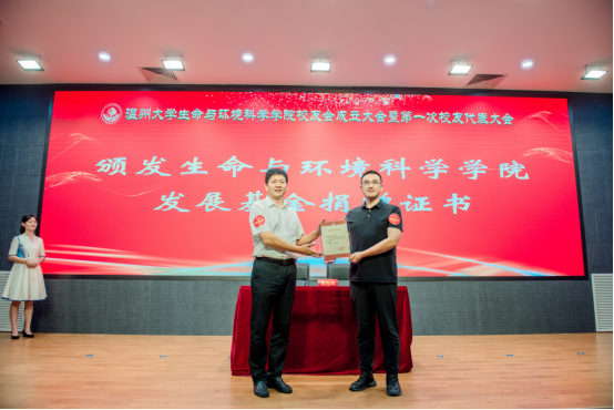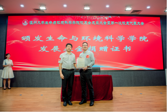 会上,学院党委书记姜海燕与捐赠校友举行签约仪式。校党委副书记庄兴忠为基金捐赠代表夏三忠、戴建博、郑健以及2000级环境科学本科班代表颁发了发展基金捐赠证书。