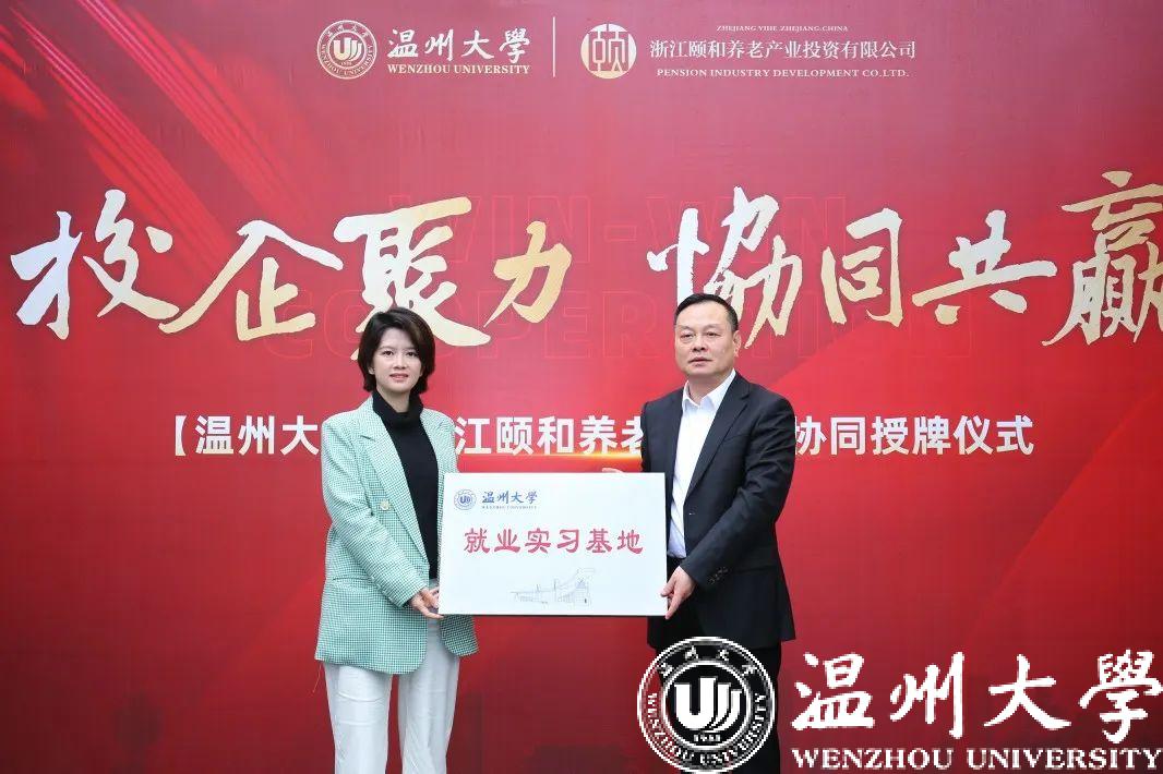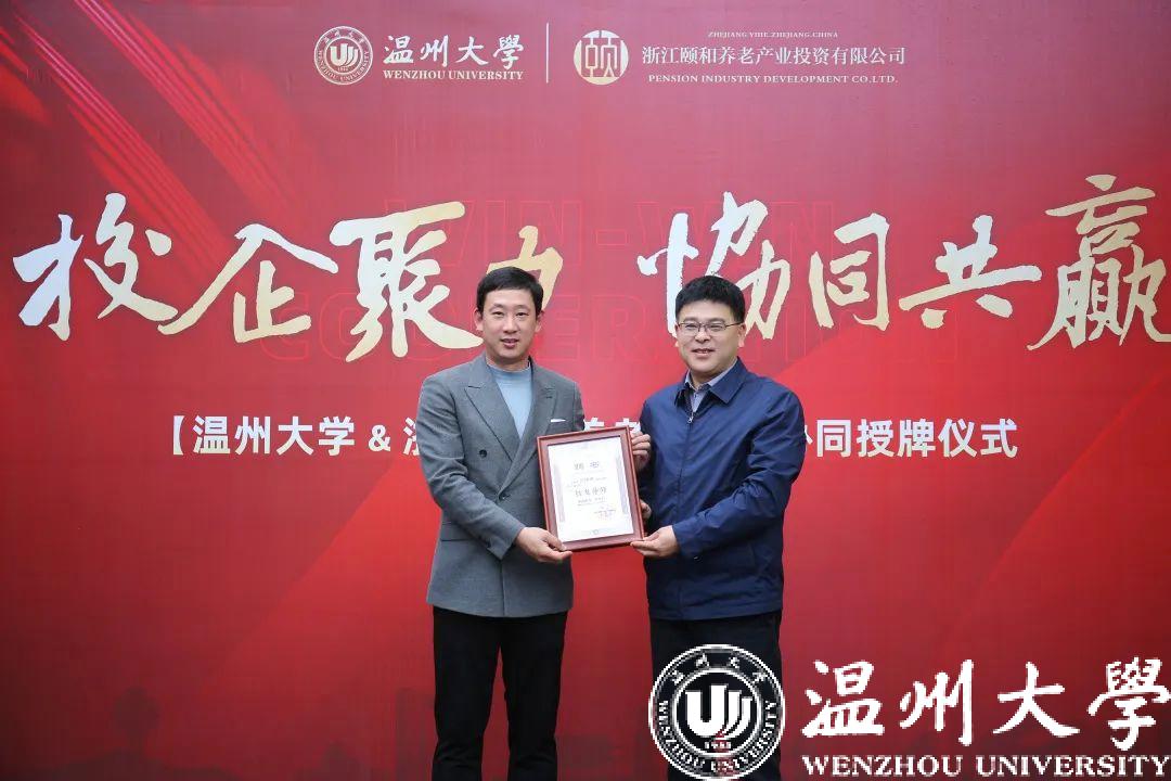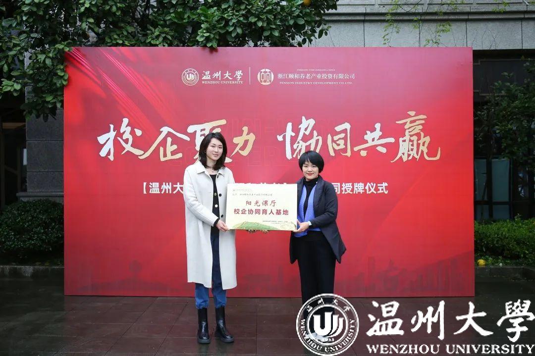 潘玉驹副校长为浙江颐和养老产业投资有限公司方面进行了小宝影院 就业实习基地授牌。体育与健康学院党委书记杨伟青为应邵斌董事长颁发校友育人导师聘书,以期借力企业资源、深度助力我院三全育人。体育与健康学院党委副书记王晓华代表温州市阳光课厅体育思政·体育思政(协同育人)工作室为浙江颐和养老产业投资有限公司教育产业部总经理倪琼艳授牌,旨在推进校企协同育人,创新合作模式。