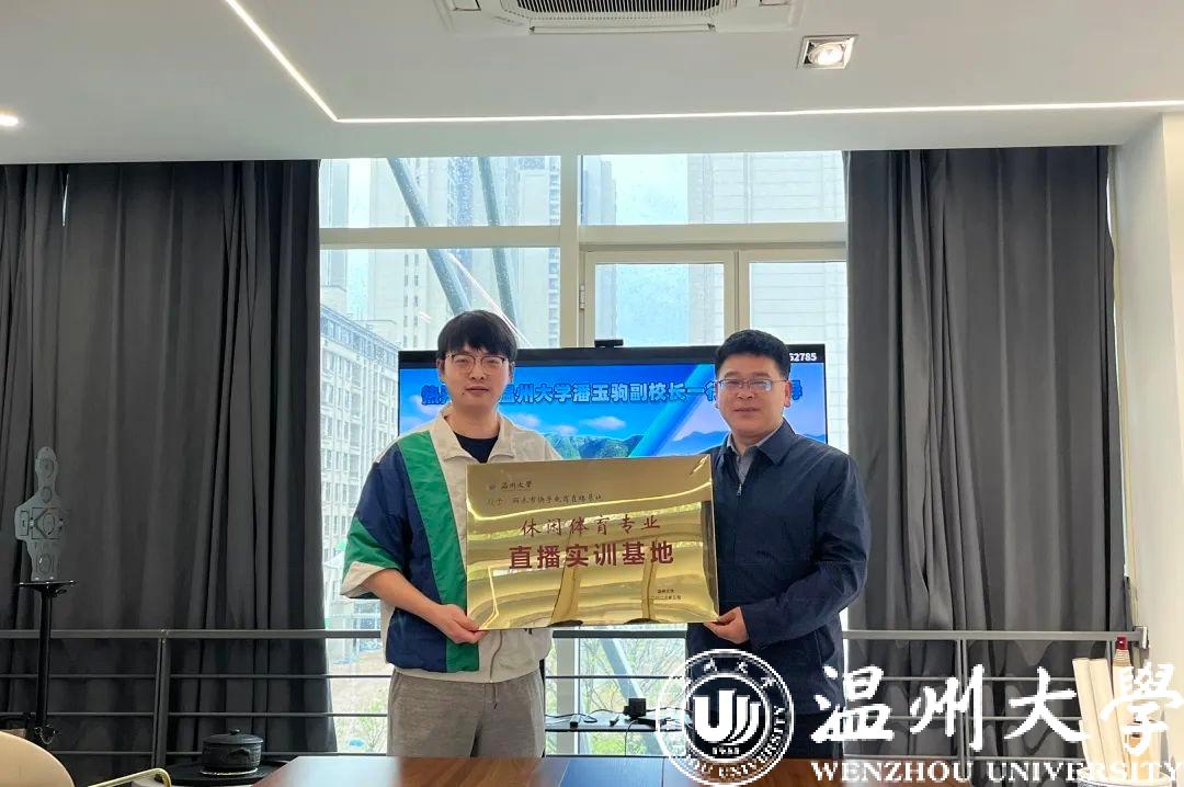 潘玉驹副校长为丽水快手直播基地方面进行了小宝影院 就业实习基地授牌。体育与健康学院党委书记杨伟青为柳挺校友授休闲体育专业直播实训基地牌。体育与健康学院党委副书记王晓华为柳挺颁发校友导师聘书。