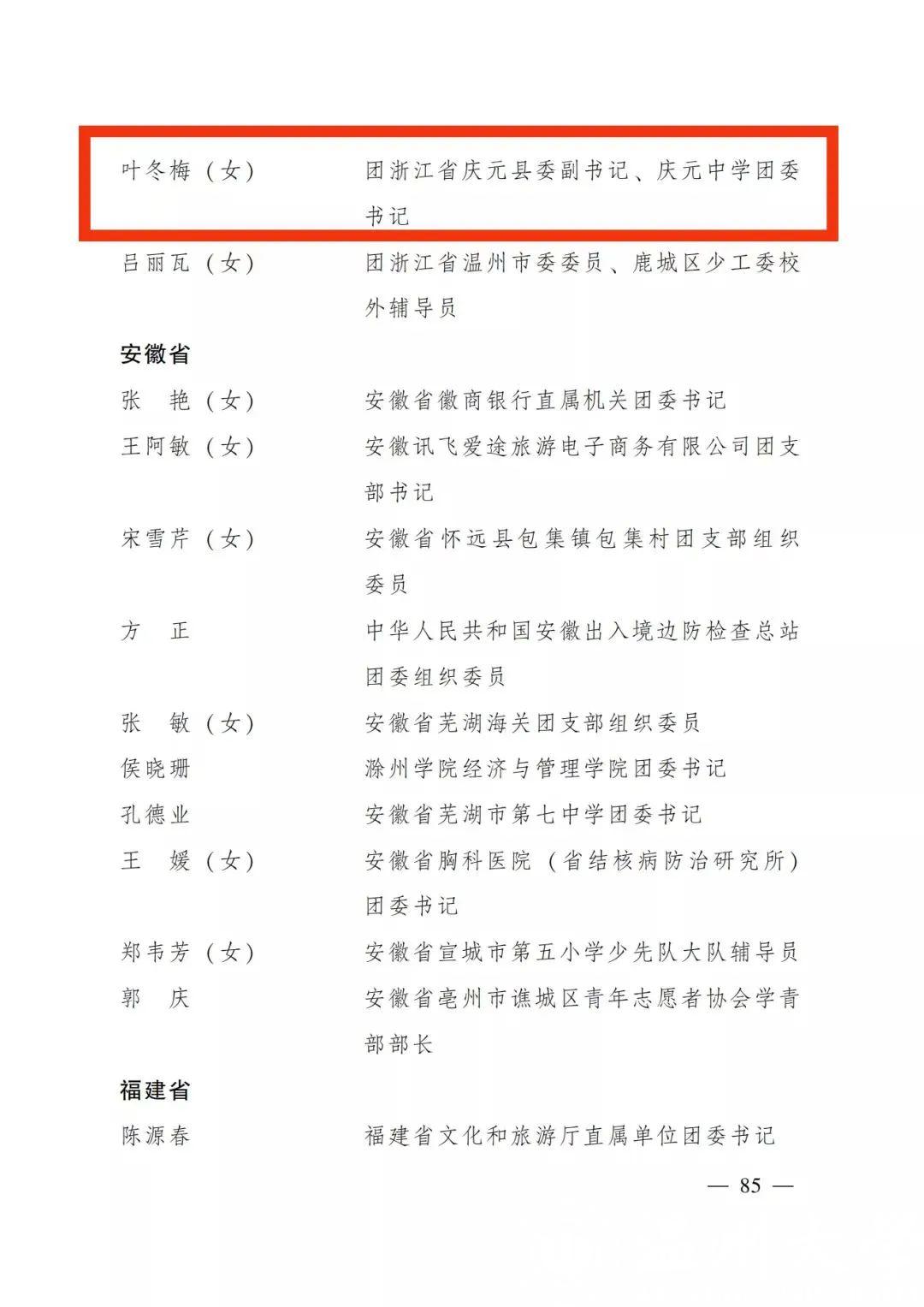 小宝影院 10级物理学(师范)专业校友、团庆元县委挂职副书记、庆元中学团委书记叶冬梅被授予“全国优秀共青团干部”。