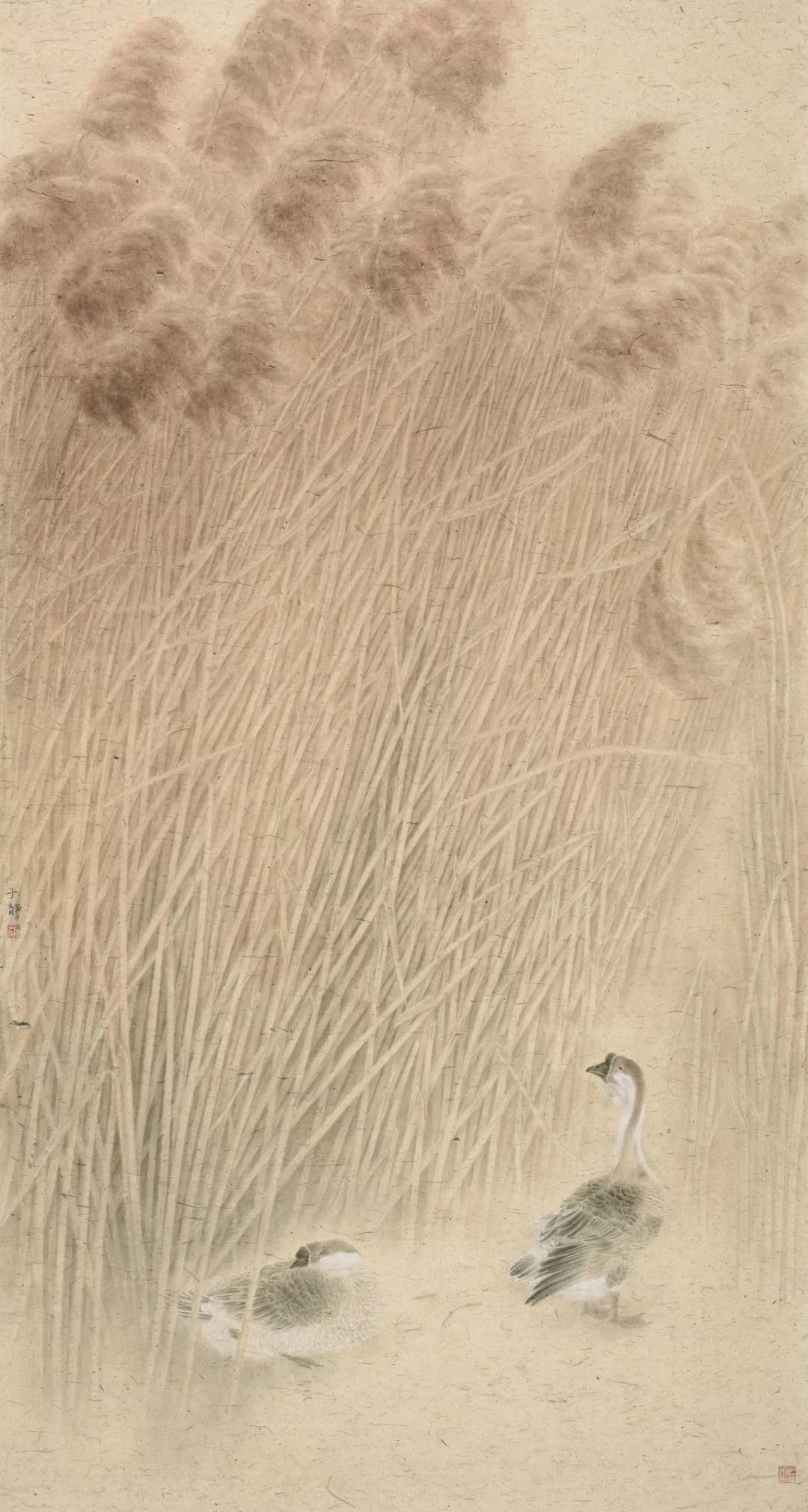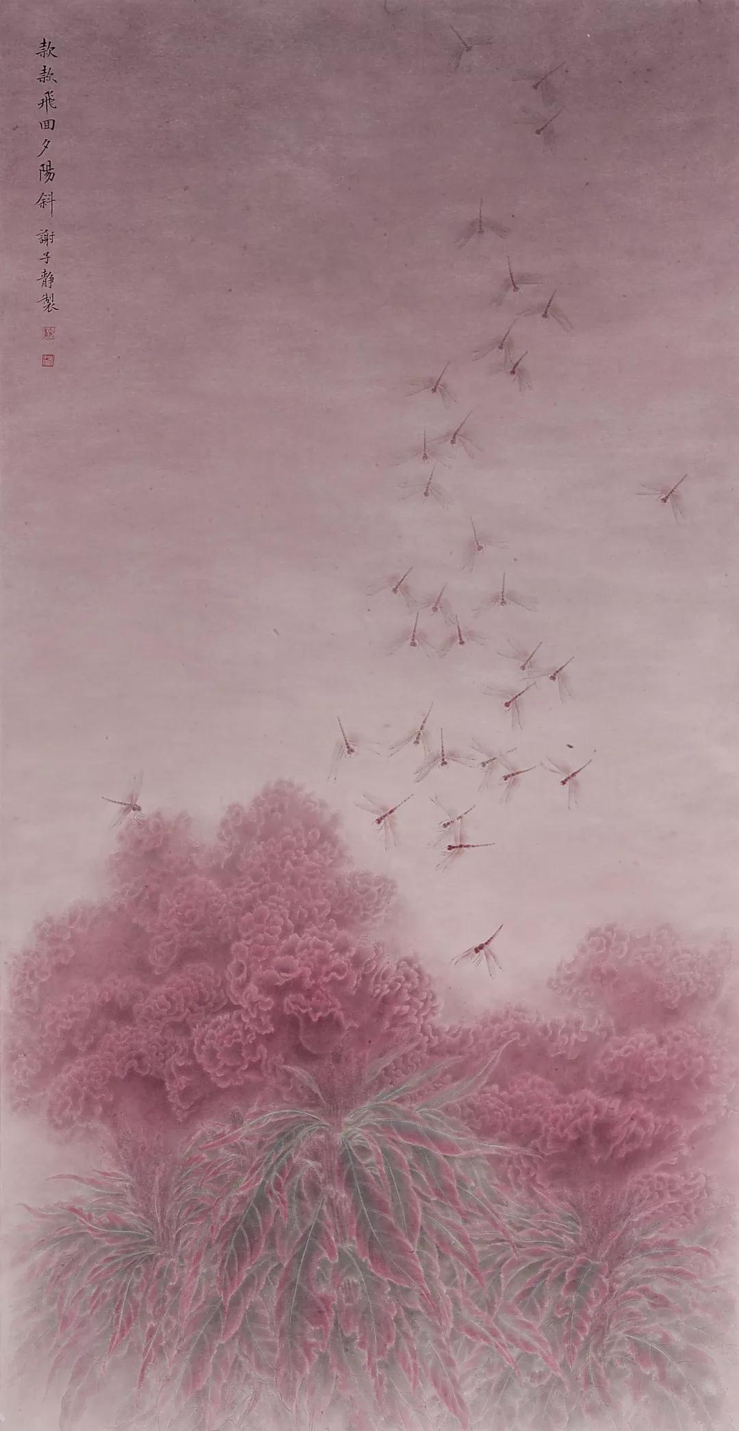 谢子静的作品以恬静、典雅、淳朴、淡泊为主旋律,而积极向上,热情乐观则是作品精神的内涵。在立意造景方面,看似寻常,但却能给人以无限遐想。如《秋露》图,画面右侧,一株强劲有力的剑麻直线挺然而立,远处数株风姿自然,并巧布在画面右侧以曲线多变的外形,构成一大空白。空白的一侧,隐藏着两只相依的禽鸟,使画面别开生面,既增添了联想的空间,又活跃了画面的气氛。意的妙趣,情的缠绵,赏之有回味,读之有余音。这种寻常的造景立意,能取得如此的艺术魅力,全在思维的敏捷,想象的豁达,虚实的巧布,笔墨的机灵。在构成布置方面,虽无惊险奇特之举,然而能让人感到平中有变、平中藏奇的感受。如《青剑》图,几株茁壮的剑麻平行直线排列,几只蜻蜓横向飞行,从画面构成来看,是一幅极为简单的纵横直线相交组合。由于平行中有耐人寻味的变化,交叉中有捉摸不定的穿插,在不经意中把那种朴实、纯洁、天然、自在的艺术情味表现得十分得体,给人以辽阔、深远、新奇、大气的美感。在设色方面,很少采用强烈夺目绚丽的色彩,而是以清淡典雅作为基调,于淡中求变化,淡中求韵味。刻意追求物象神质情态的表现,以达到最强度的艺术感染力。如《蒹葭苍苍》图,作品以平日里采风、写生途中所见的芦苇与嬉栖的白鹭为画材,旨在表现自然界动人和谐的一幕,寄寓着摆脱尘俗,融入超逸的自然景界,抒发了一种美好的心境。画风以宋明院体花鸟画之雍容谨严为典范,参以文人画逸笔的幽远意境与简澹设色,营造画者心中氤氲已久的古典幽梦。篇幅宏阔,意在改变历代花鸟画常见的小品格局,赋予作品以富有张力的现代视觉形式效果。如《荷风送香》图,整幅画面如同一曲抒情的轻音乐,使人沉浸而陶醉。青绿色的荷叶,在淡泊中见有沉甸厚重之感,叶面周边施以淡赭,不仅取得温柔的冷暖对比效果,也把荷叶的生态美表现得鲜活纯真。白色的荷花,着粉不滞板,恰到好处,把花瓣沉稳而透亮的质感表现得极为优美。月黄的莲蓬更是意气妖态,飘飘然而欲舞,默默然若移步,似有清香袭人,如临野塘晨风,水天一色,花草和谐,赏之悦目,读之心怡。这种境界正是谢子静匠心用色所追求的艺术情趣。《传承.蜕变》是谢子静近期的创作作品,画面表现的是温州古戏台的一组组戏曲彩绘图饰,辅以吉祥纹饰。彩绘人物动态夸张、生动,线条运用娴熟、流畅,色彩斑驳、厚重,以传统的工笔重彩技法记载了温州戏曲文化与民俗文化。作者正以其特有的视角和方式关注温州戏曲文化遗产,倡导温州南戏的传承与蜕变。更有得一之想的是画面以一只飞鸟置于前景,将不同时期舞台的图饰作为背景,达到穿越时空的联想。以花鸟画的形式来表达戏曲的题材内容可能当属首次,这充分说明作者对事物观察的敏锐性和大胆创意的精神,关注其传承与蜕变。